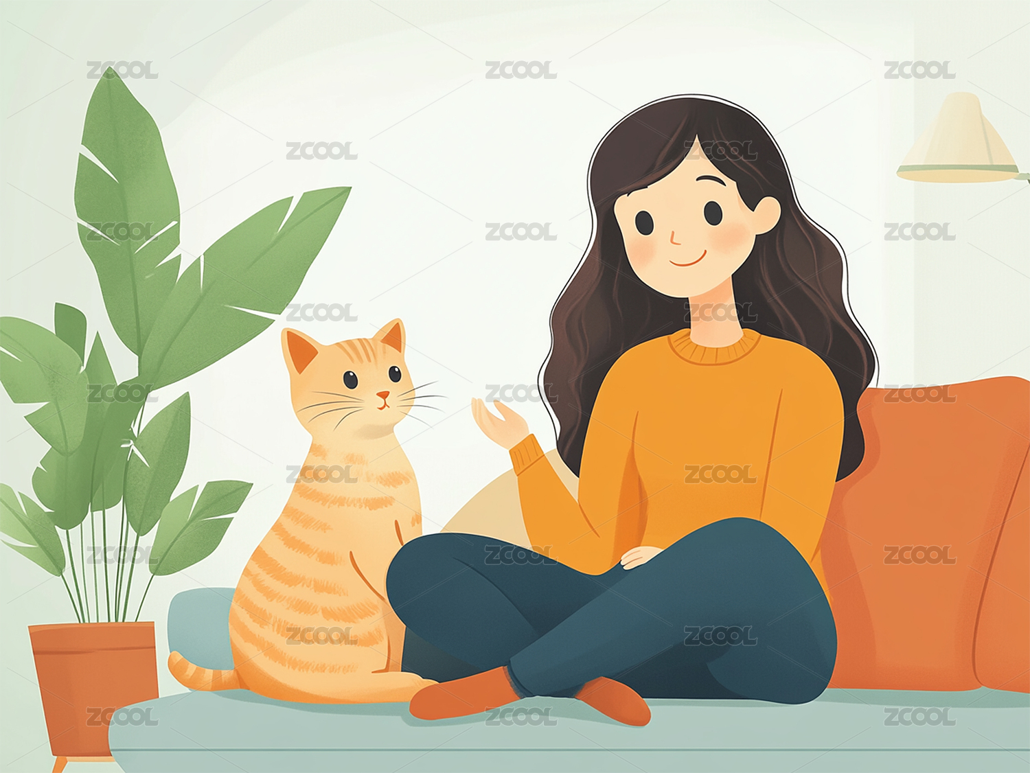 一个穿毛衣女孩与一只猫咪坐沙发上互动插画