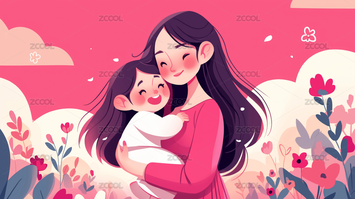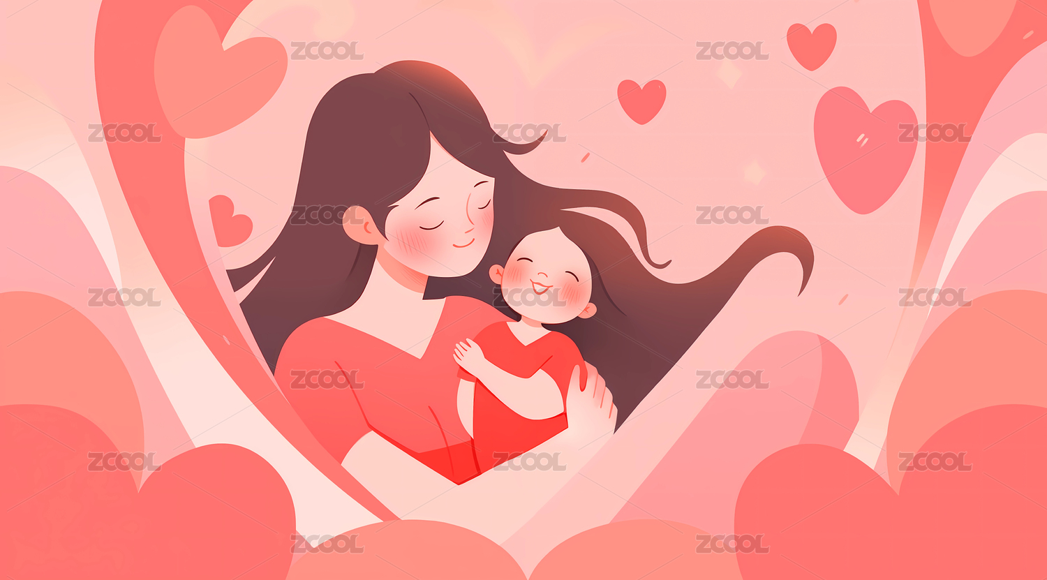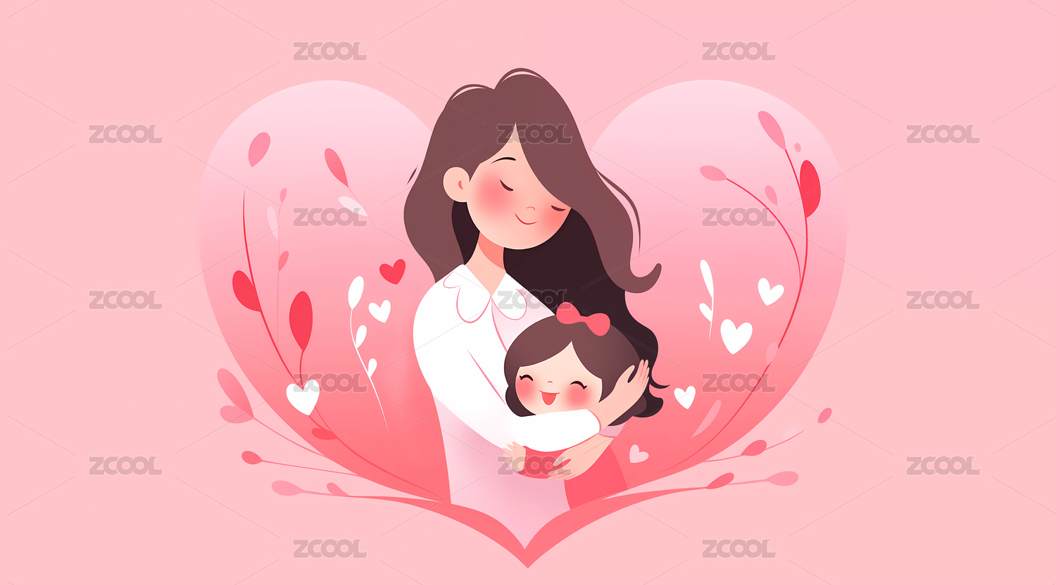 粉色背景,母亲拥抱着女儿,幸福地微笑