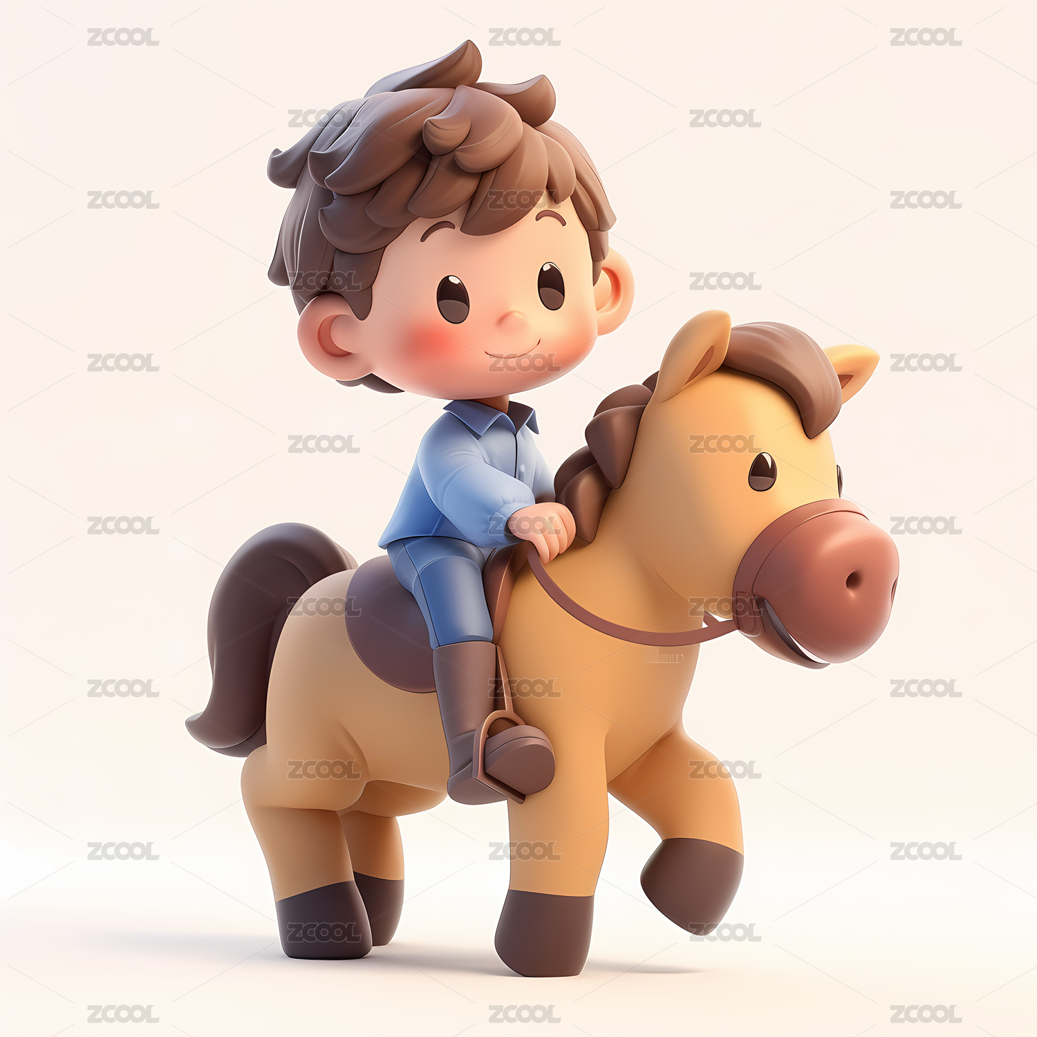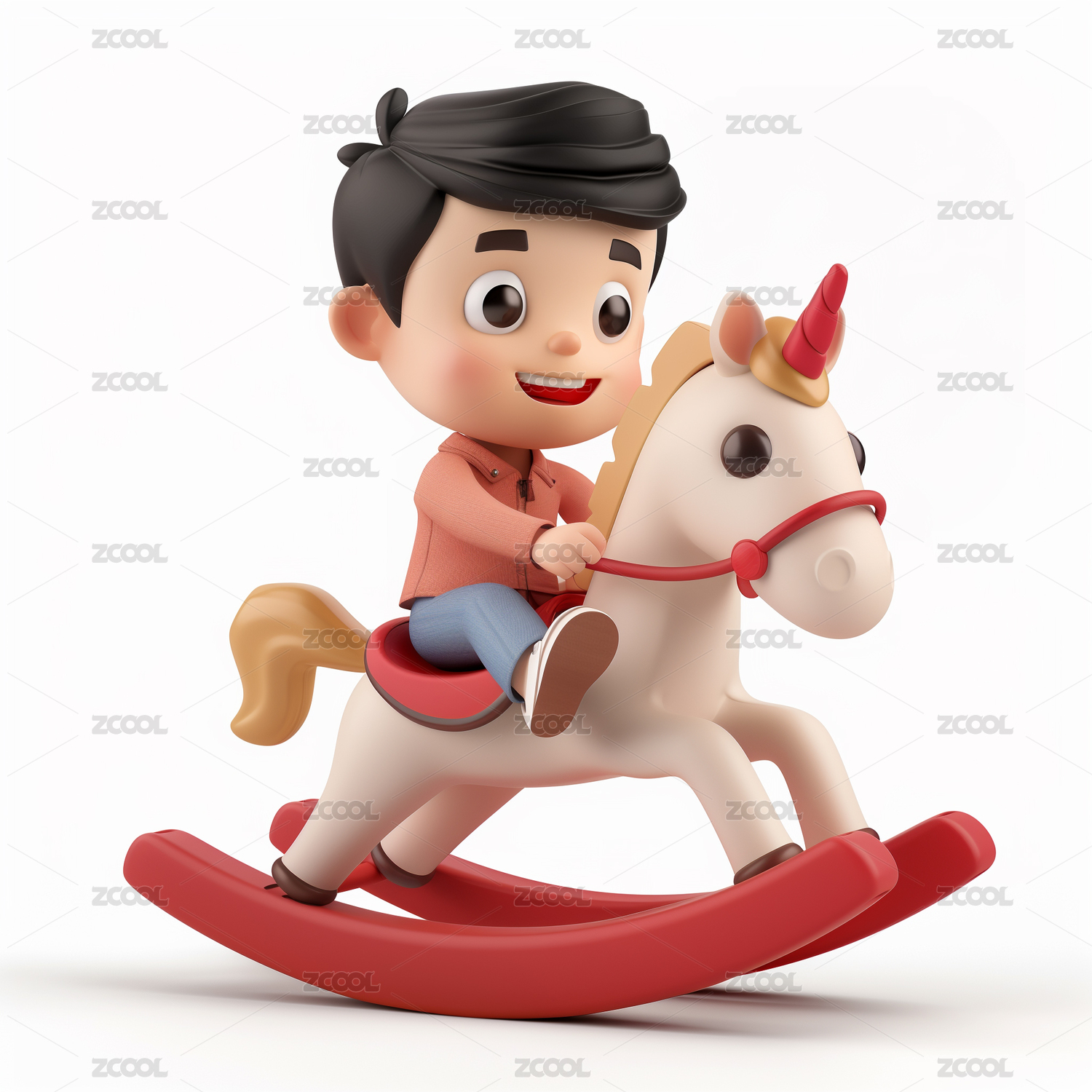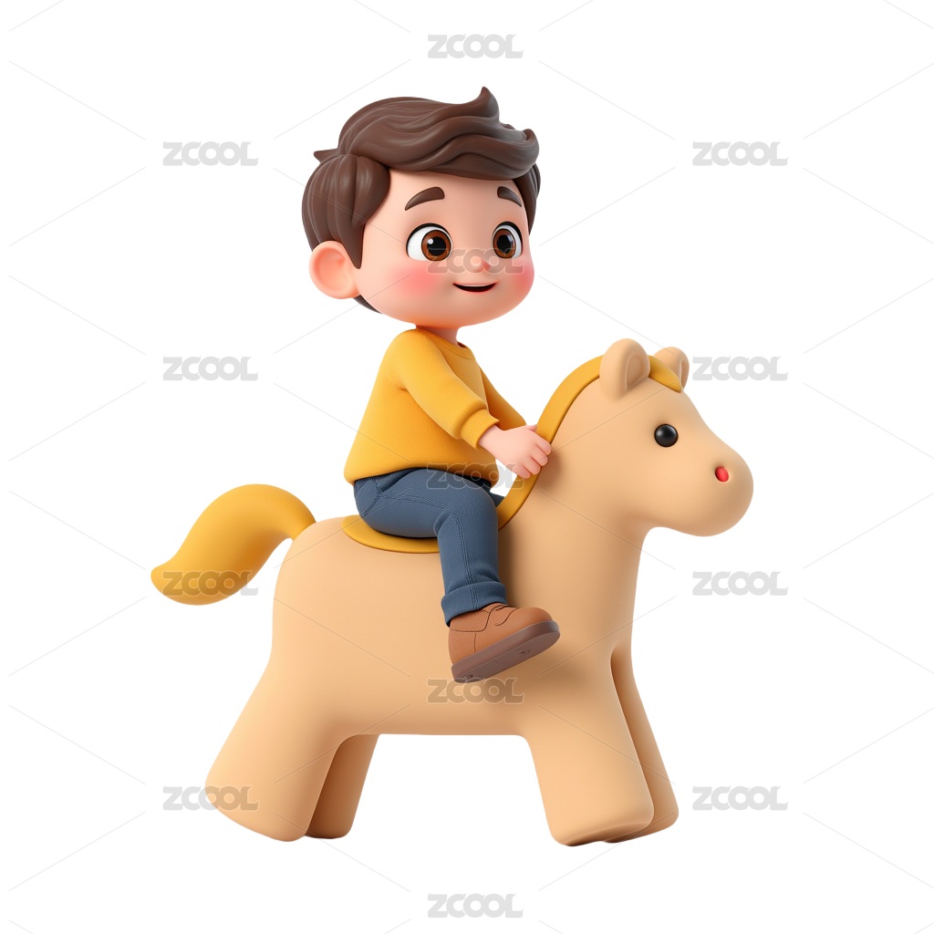 小男孩骑儿童玩具摇晃木马白底3D卡通插画