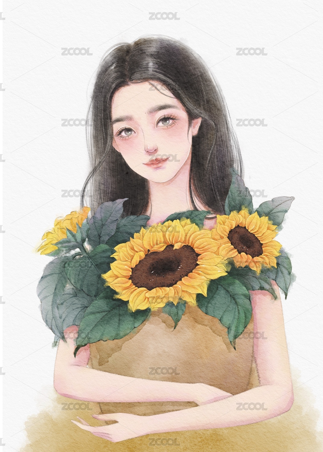 美女插画向日葵