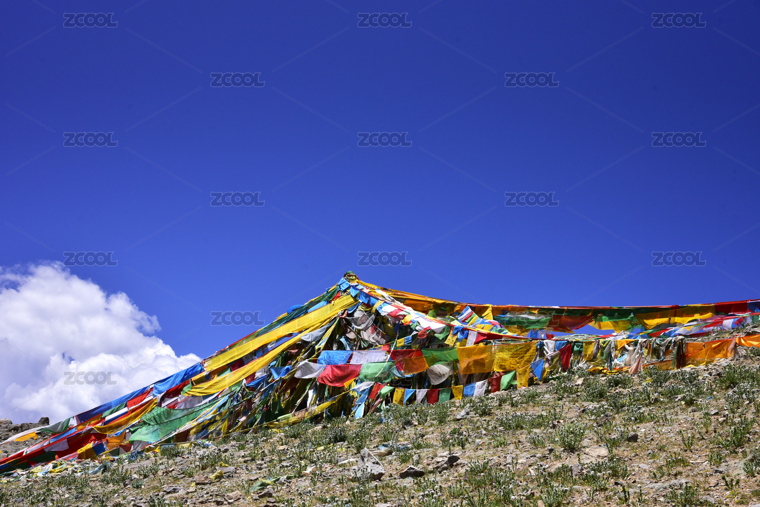 中国青海祁连山五彩经幡蓝天白云