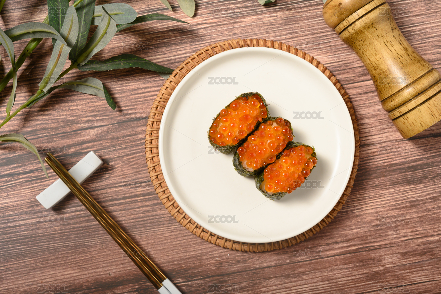 桌面上的盘子里的美味可口的三文鱼子寿司