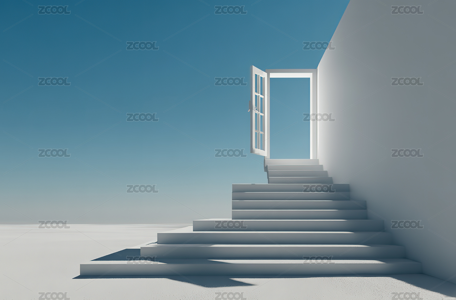 白色阶梯通向发光门的极简场景