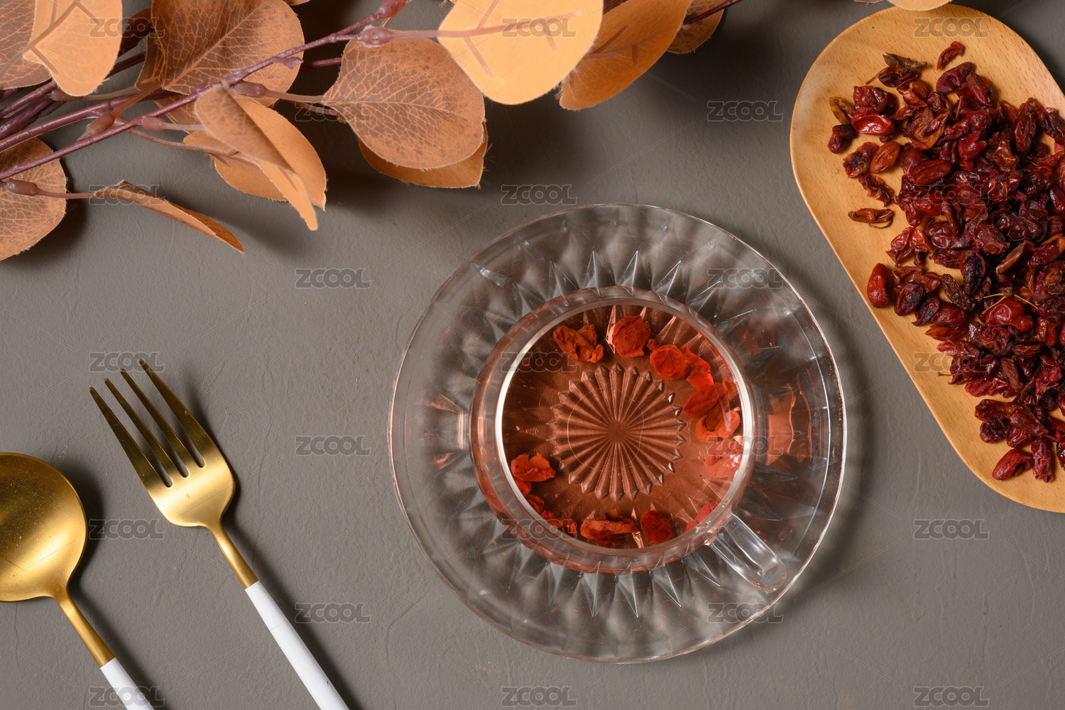 桌面上的杯子里的甘甜可口的山茱萸茶