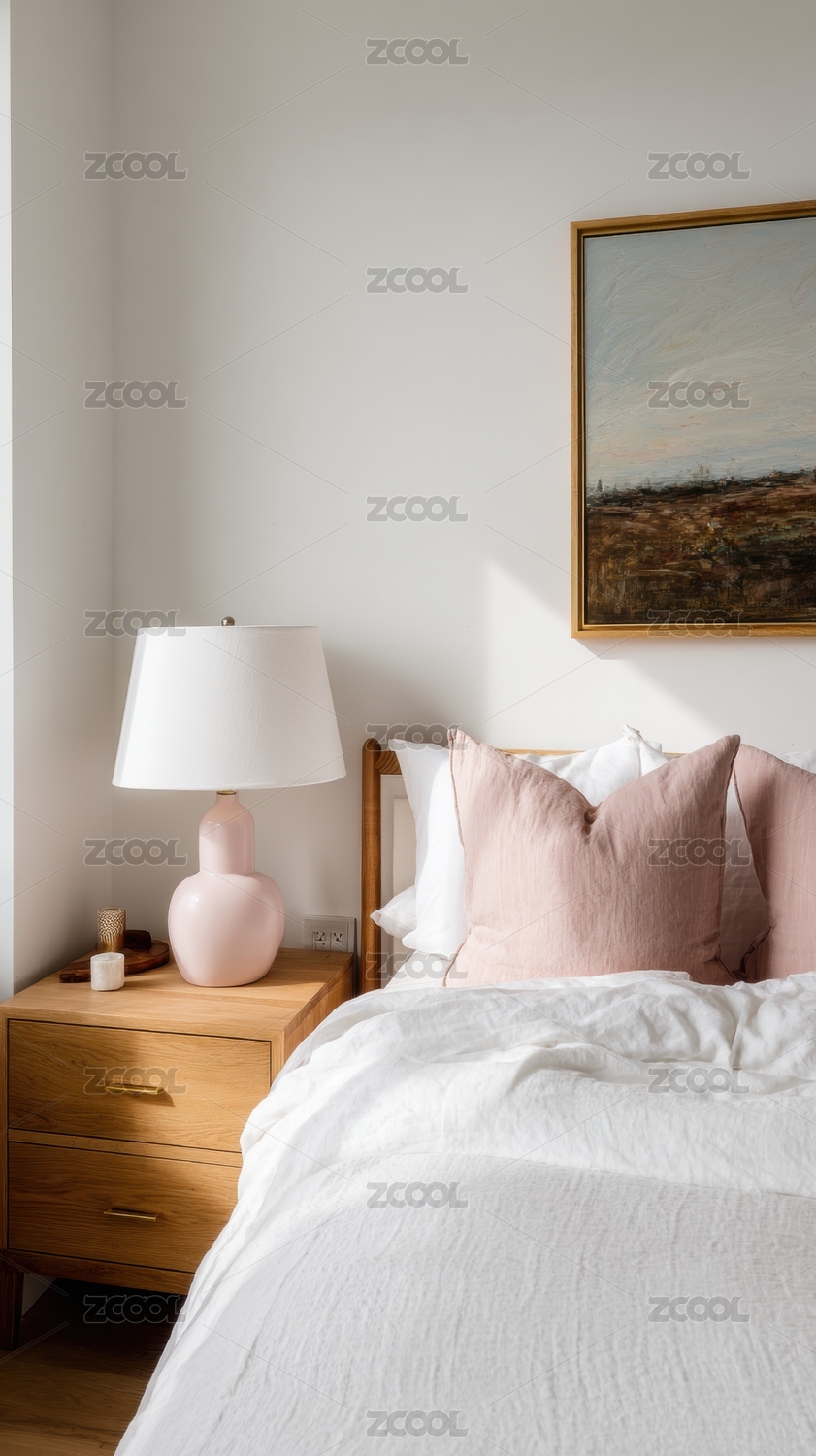 温馨卧室一角粉色靠垫与木质床头柜