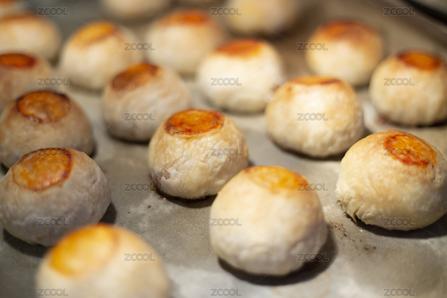 圆圆的黄色酥饼在黄金的多个蛋黄流心酥中间