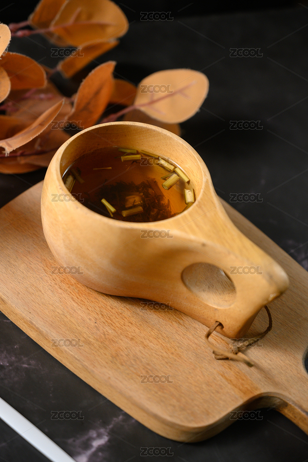 桌面上的杯子里的甘甜可口的夜交藤茶