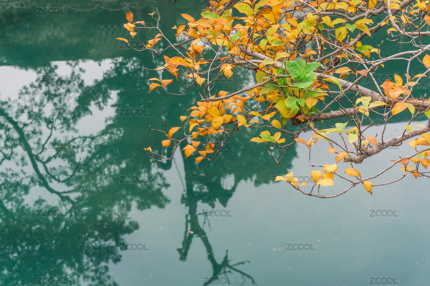 中国四川九寨沟的水与黄叶