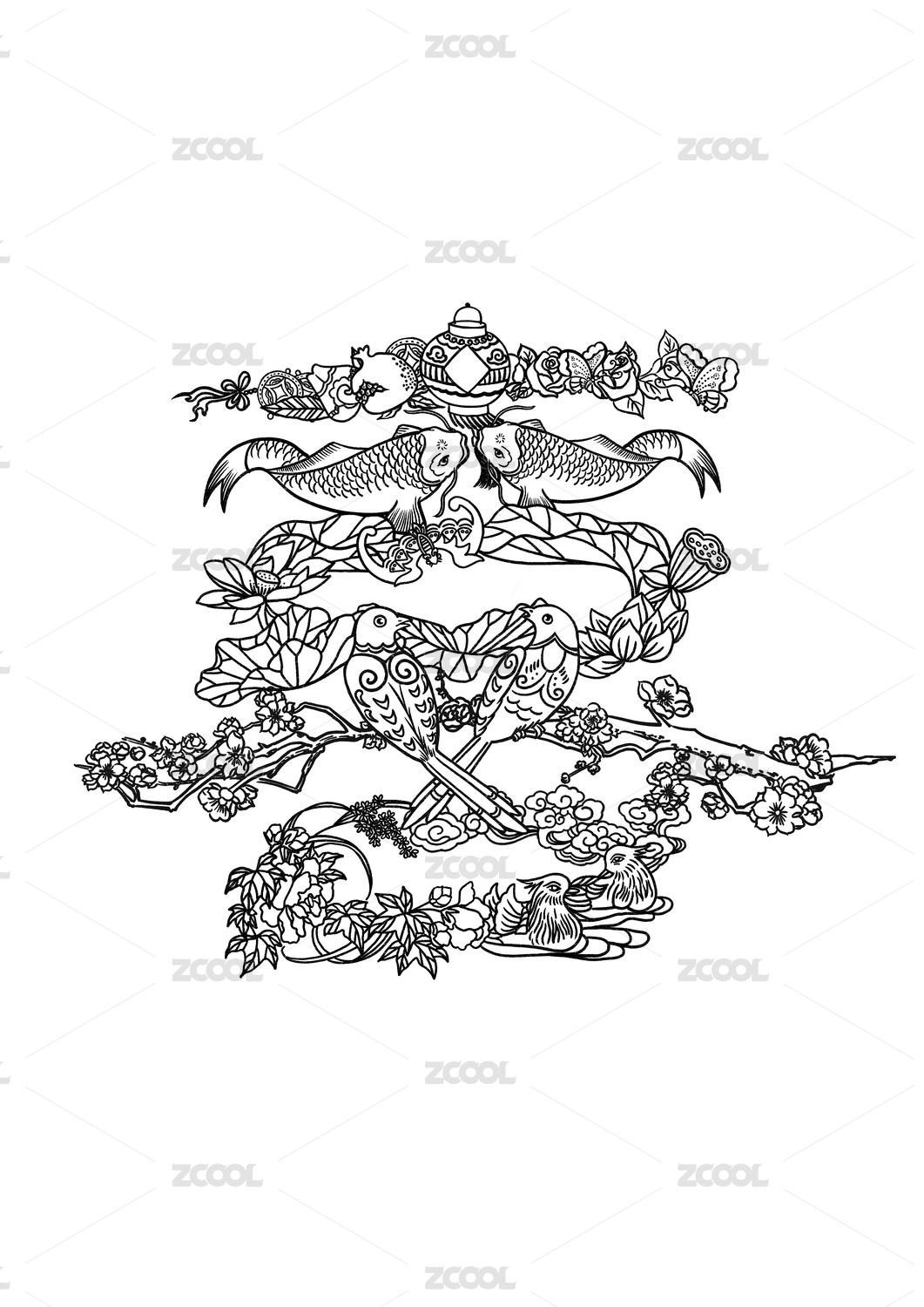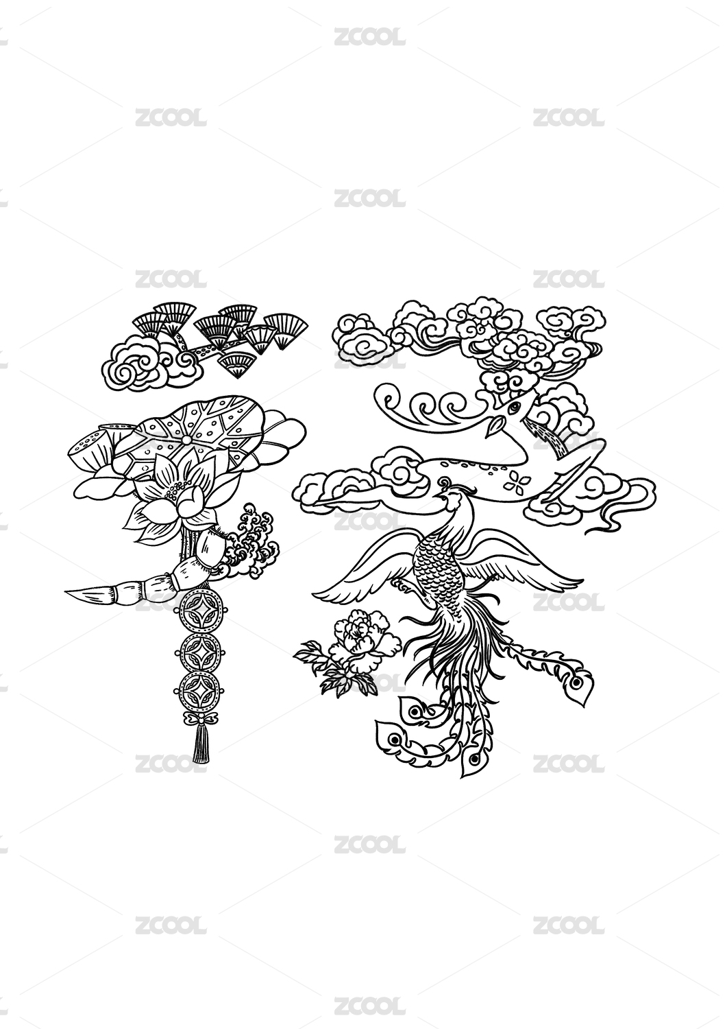 中国传统的凤凰祥云黑白线条图案