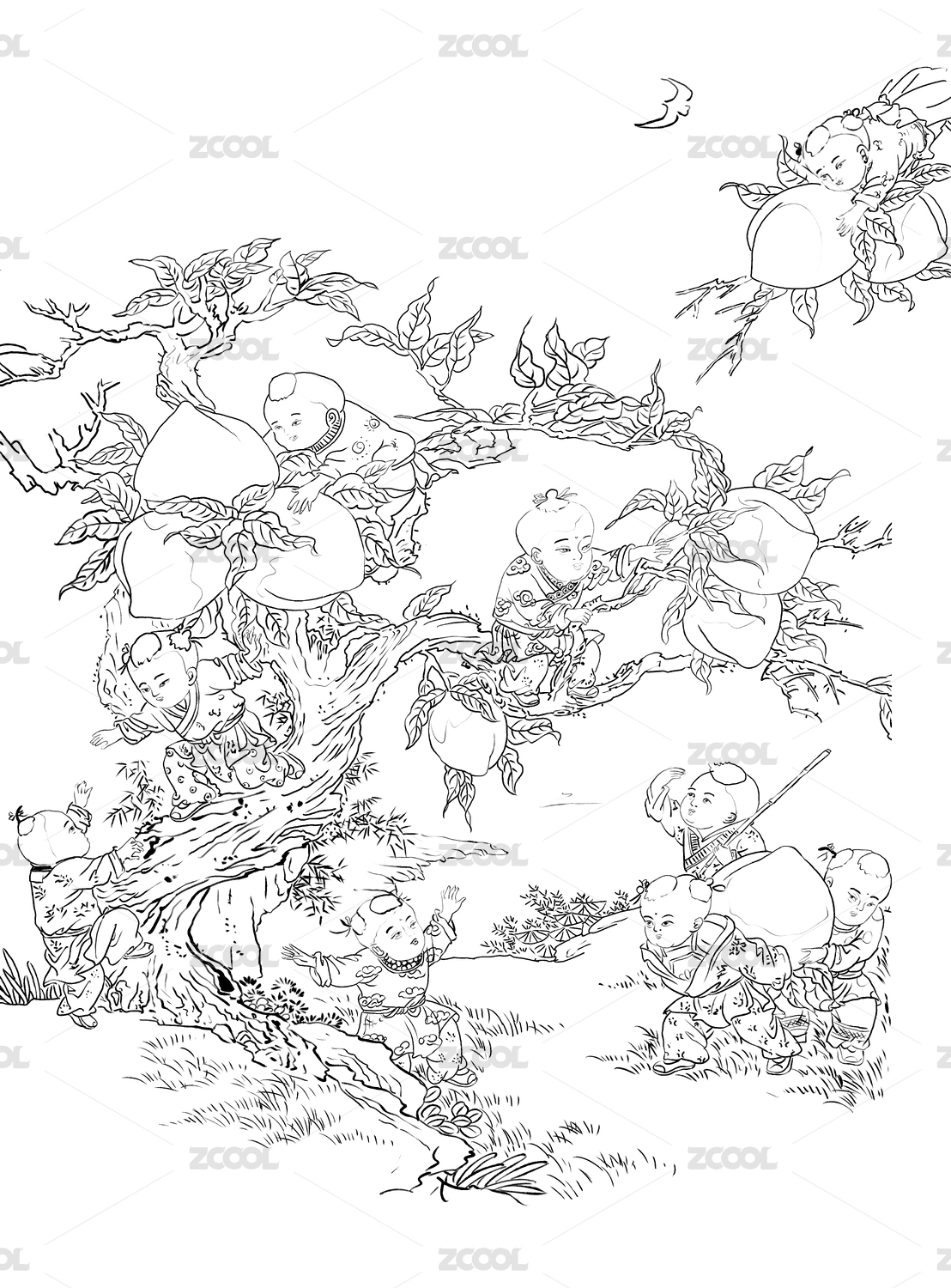 九子攀桂图白描国画工笔