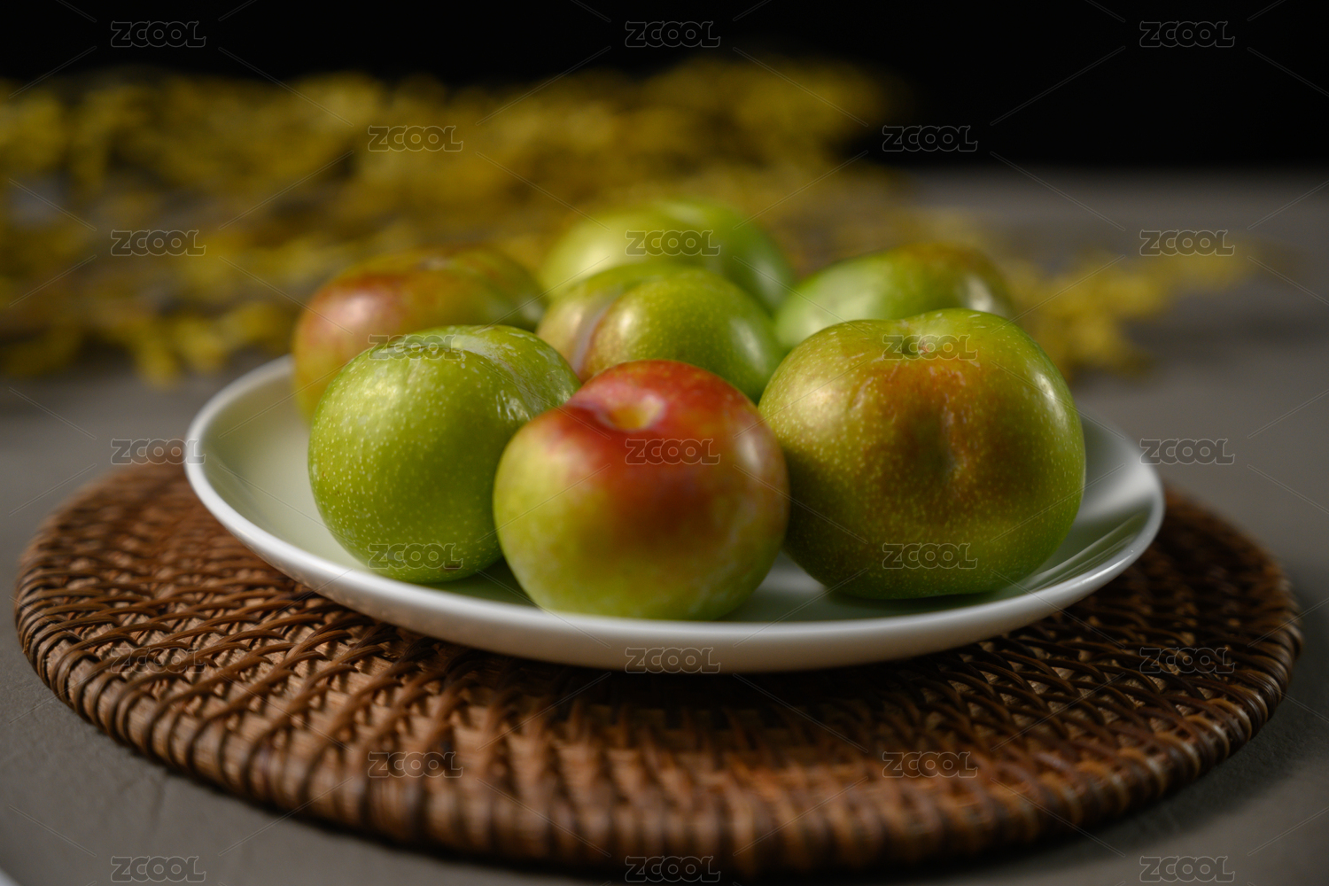 桌面上的盘子里的美味可口的四季李子