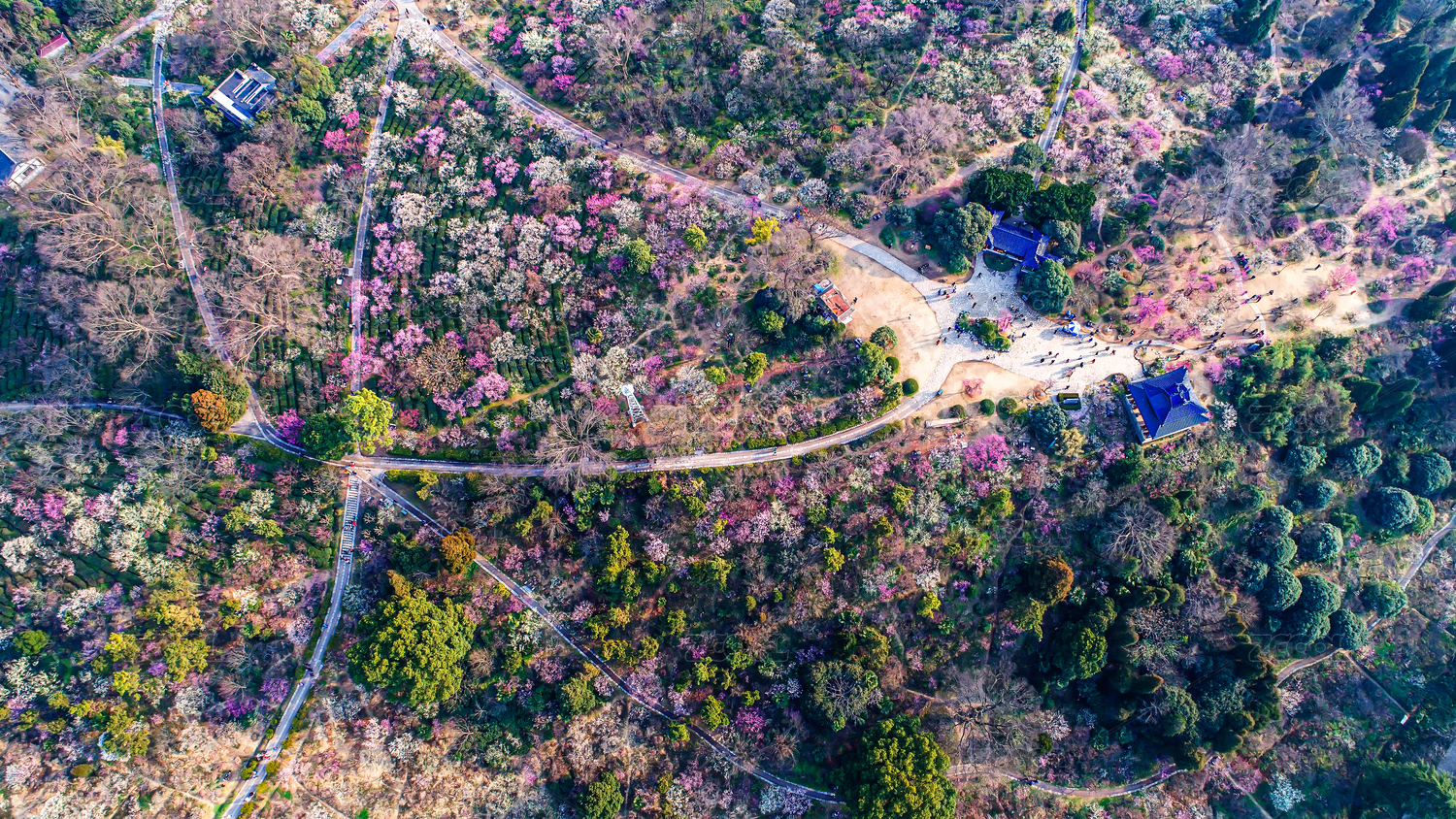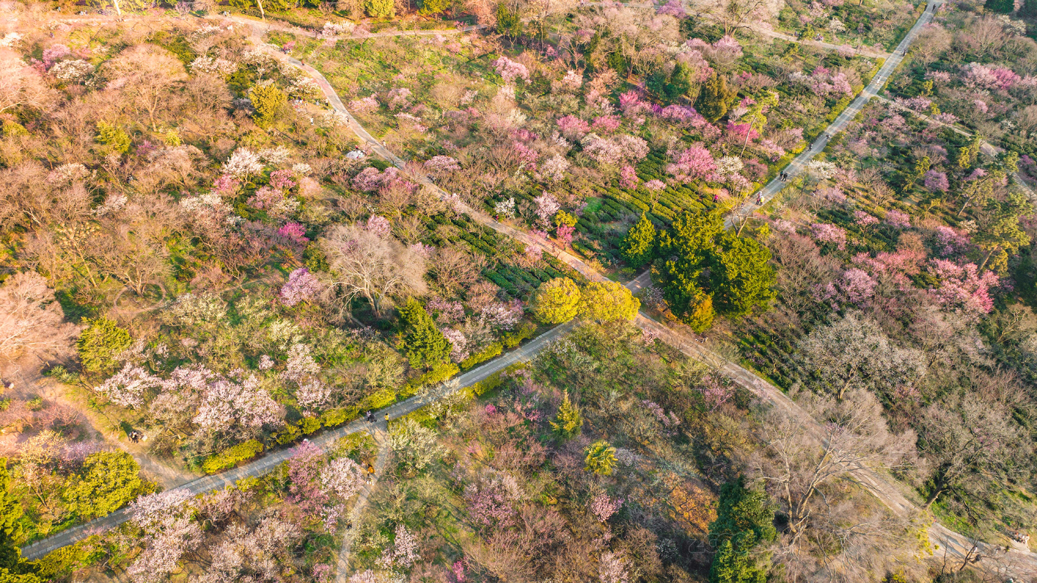 航拍江苏省南京市春季五彩斑斓梅花花海