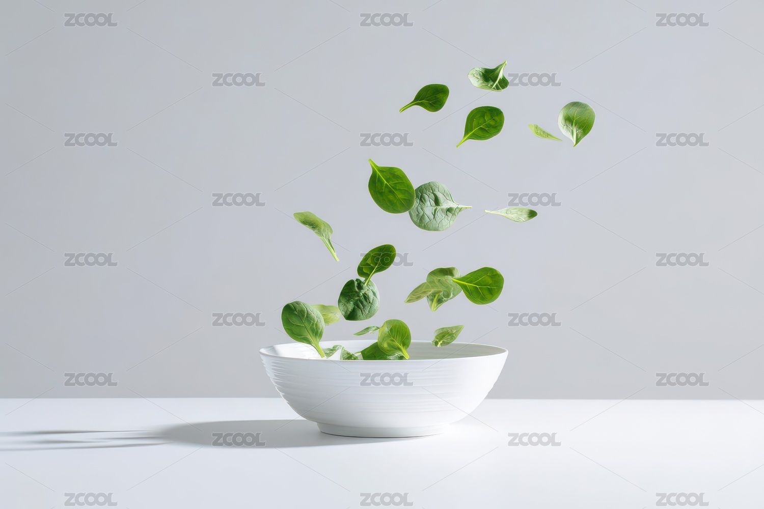 新鲜菠菜叶飘落进白色陶瓷碗中