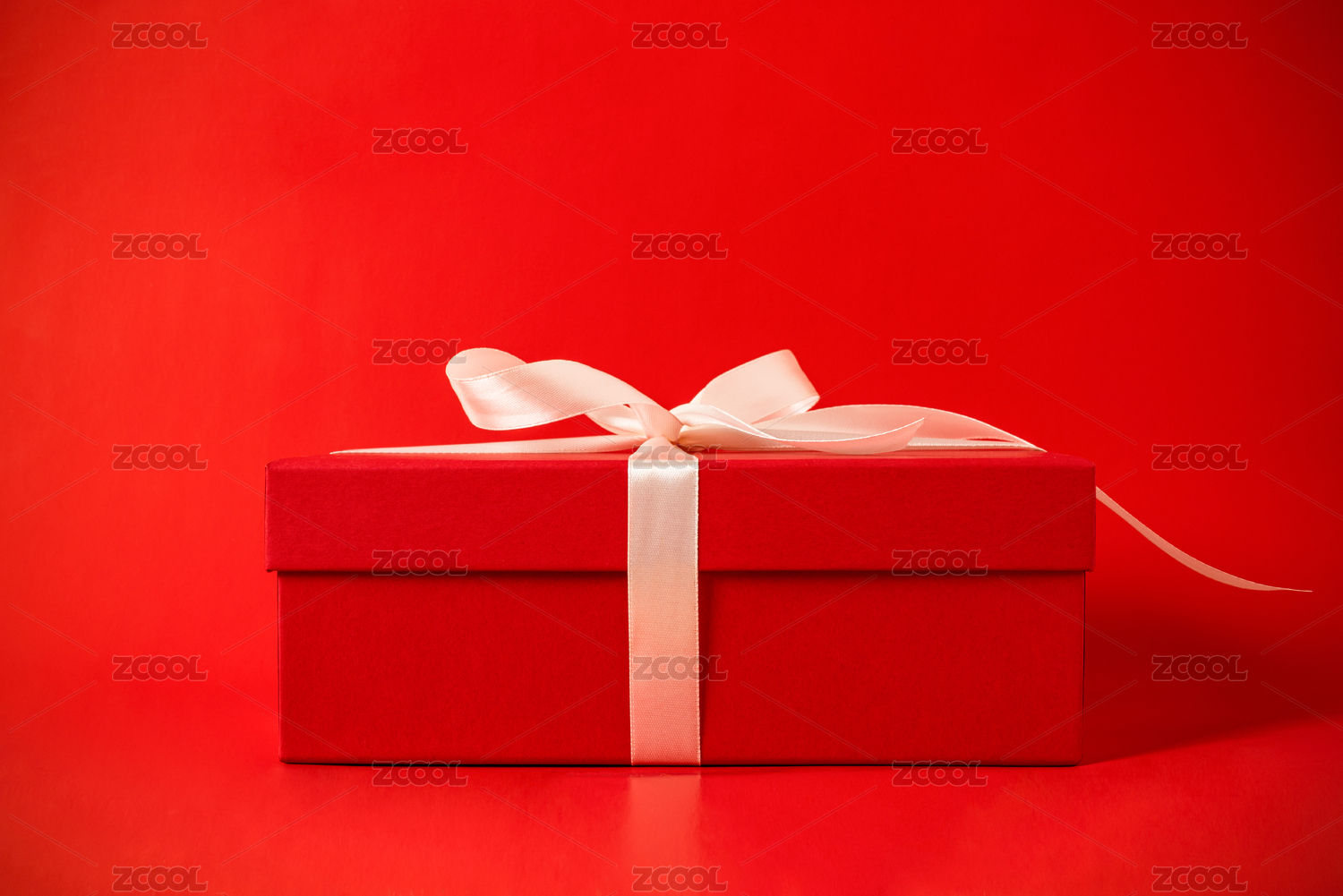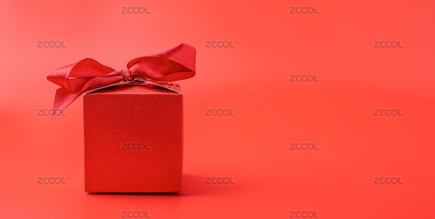 平放在红色背景的绑着香槟色带子的中国红礼品盒