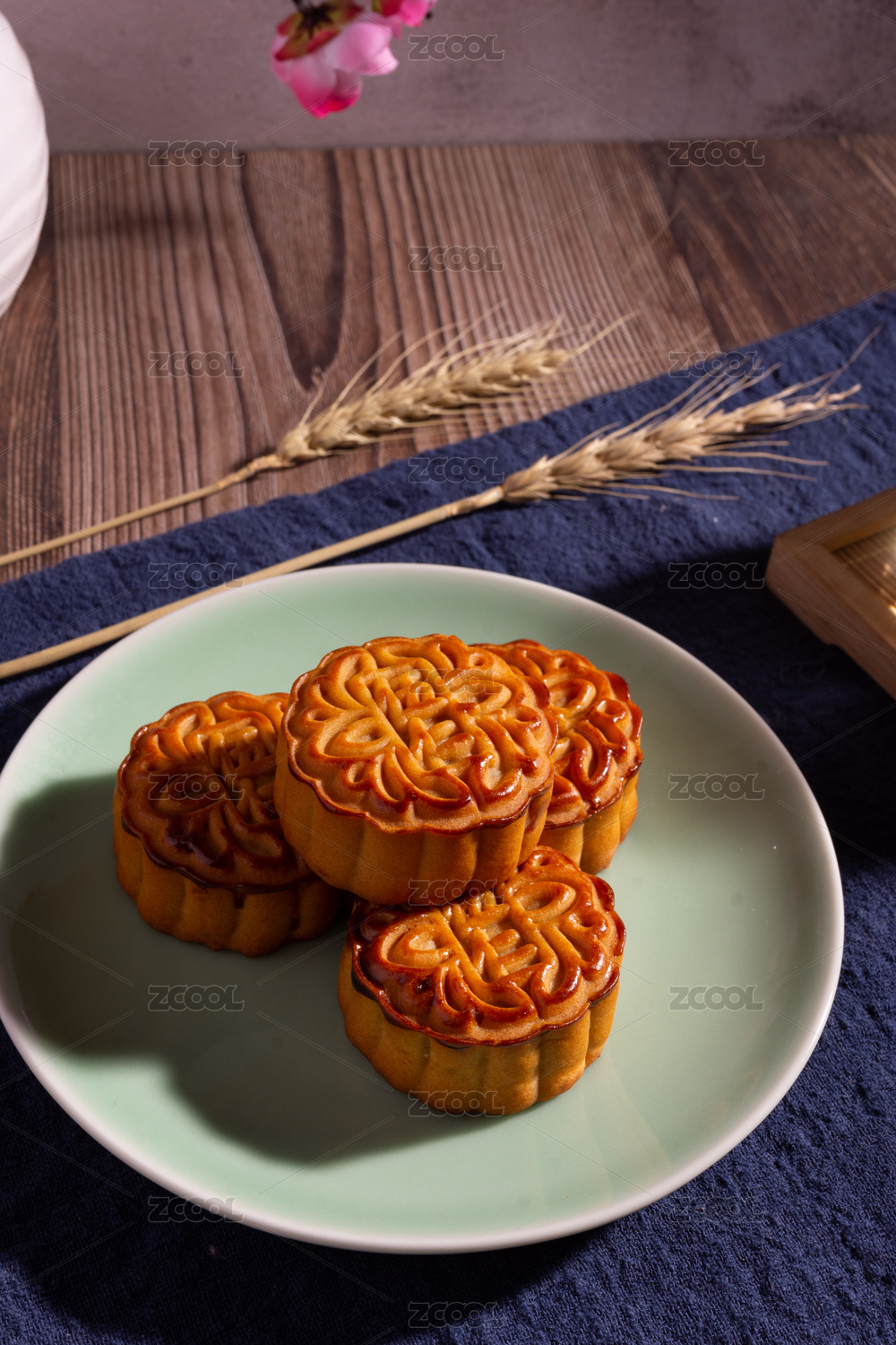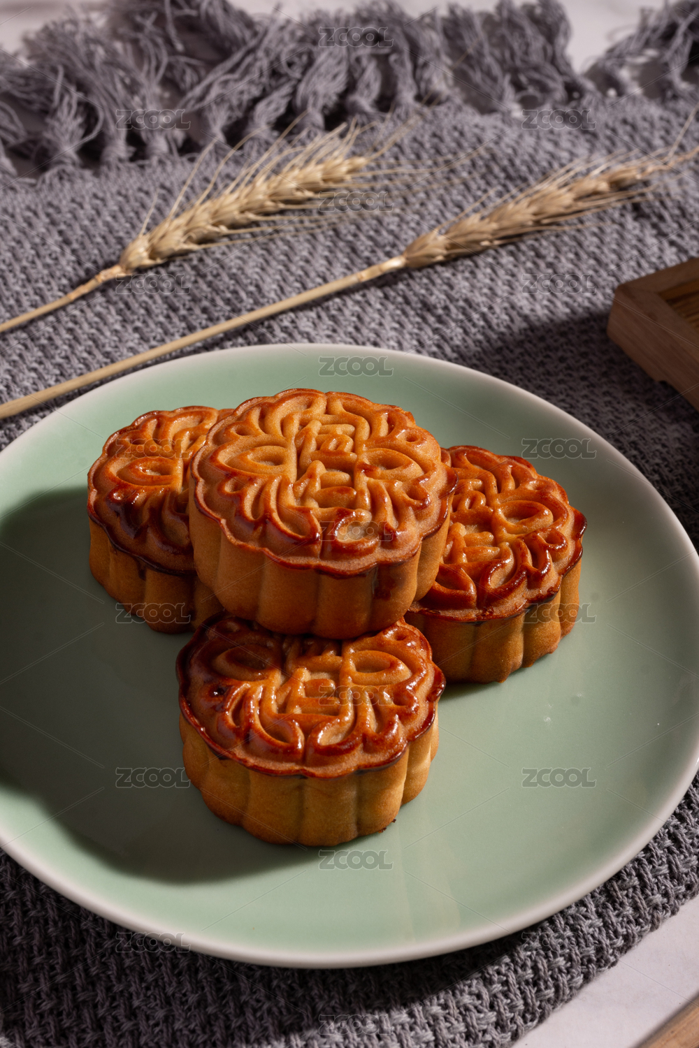 中秋节传统美食月饼与茶水特写古窗棂木桌面