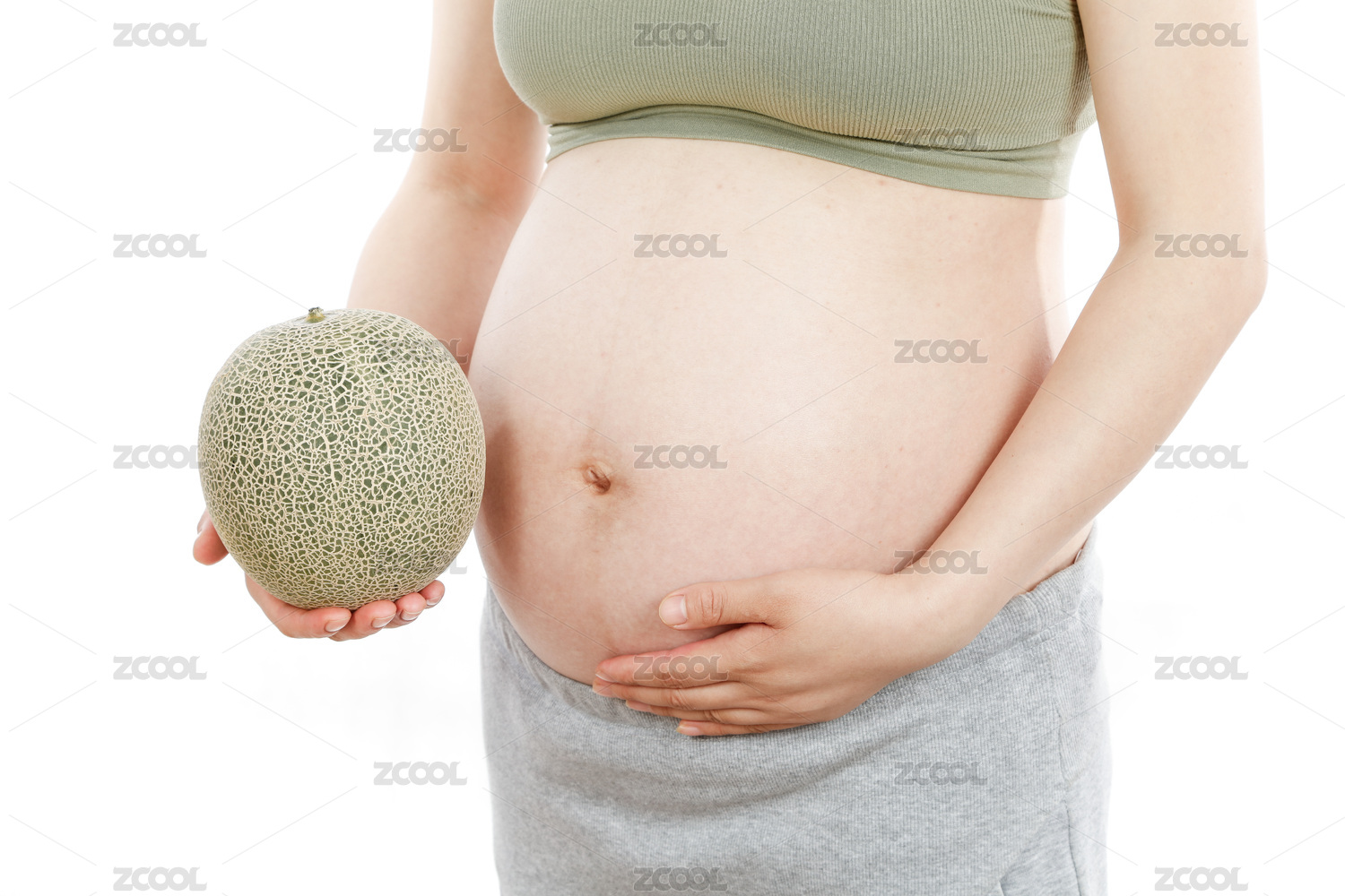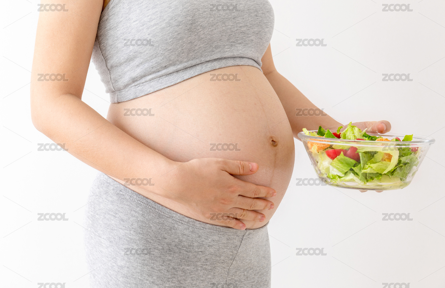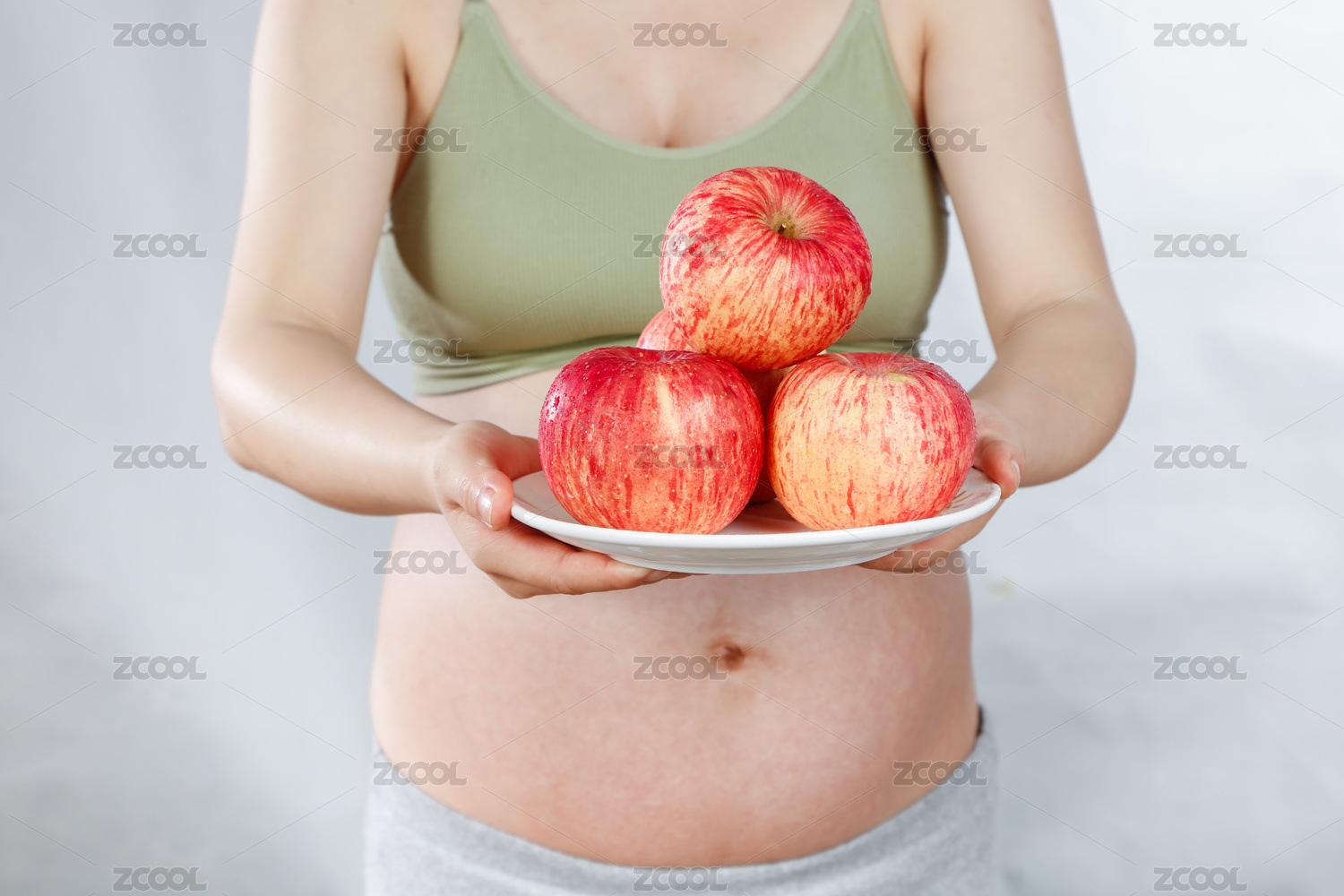 年轻的孕妇手上端着一盘苹果和吃着苹果