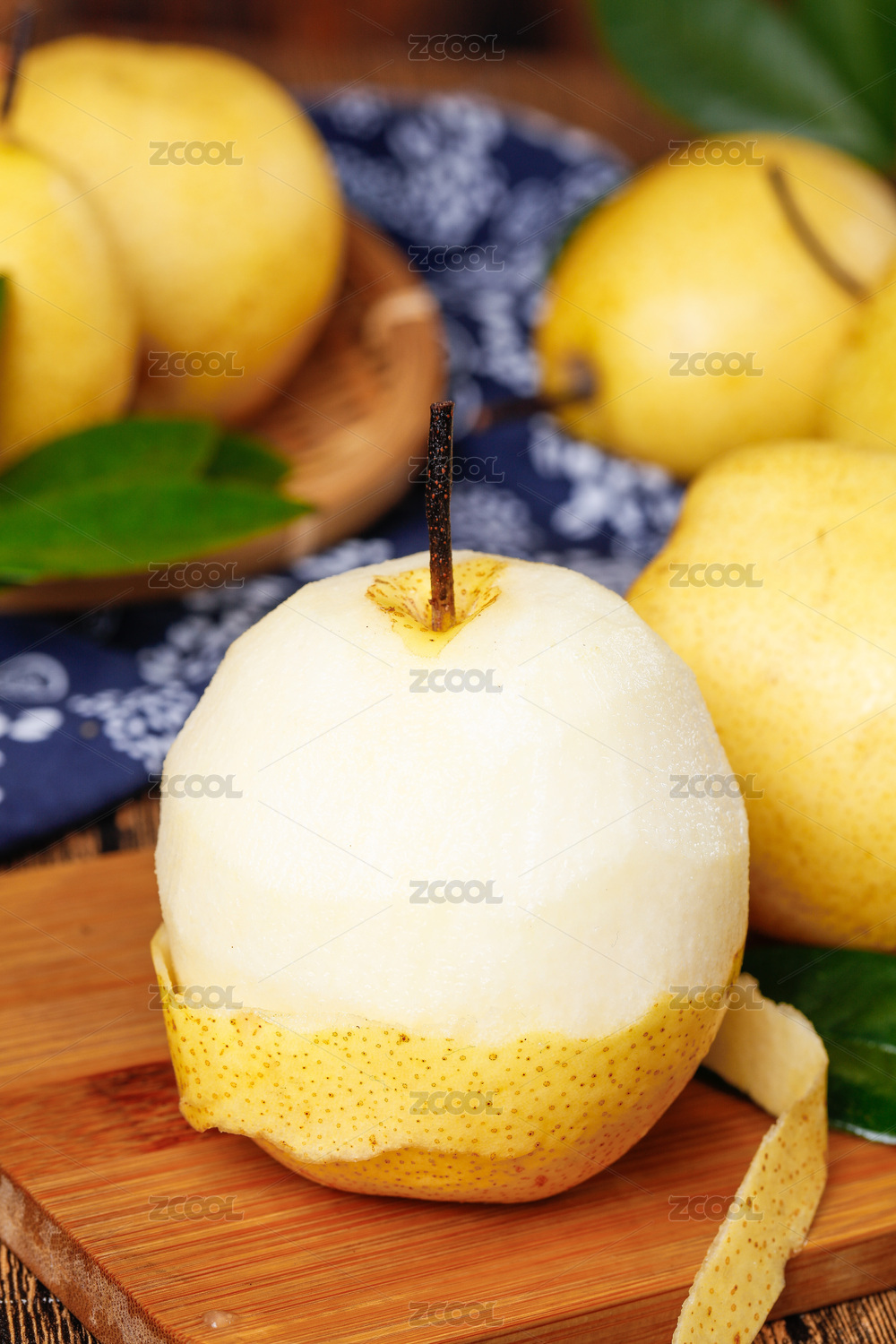 木板上放着一个完整赵州雪梨和一个削皮酥梨