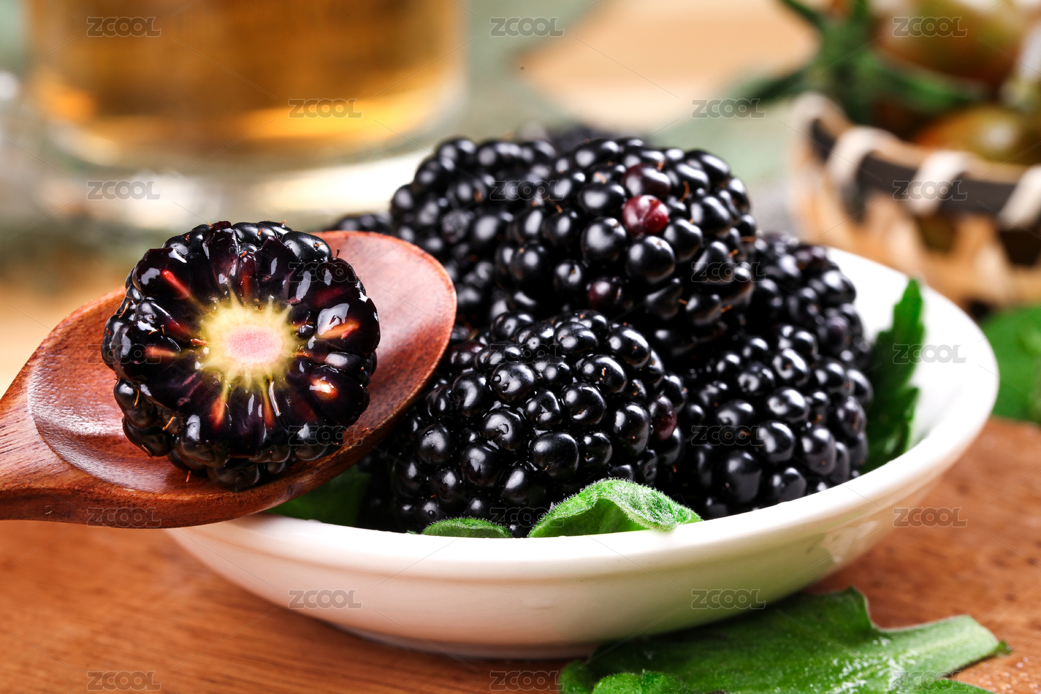 木底上放着一盘新鲜黑莓和勺子上挖着黑莓