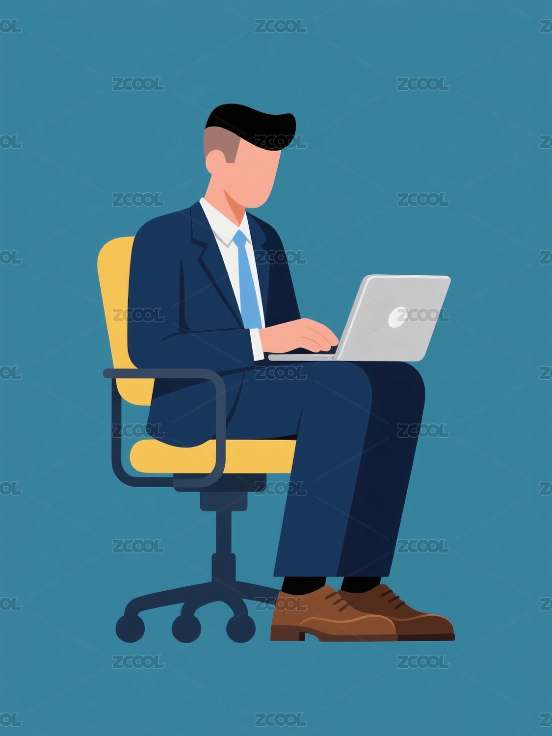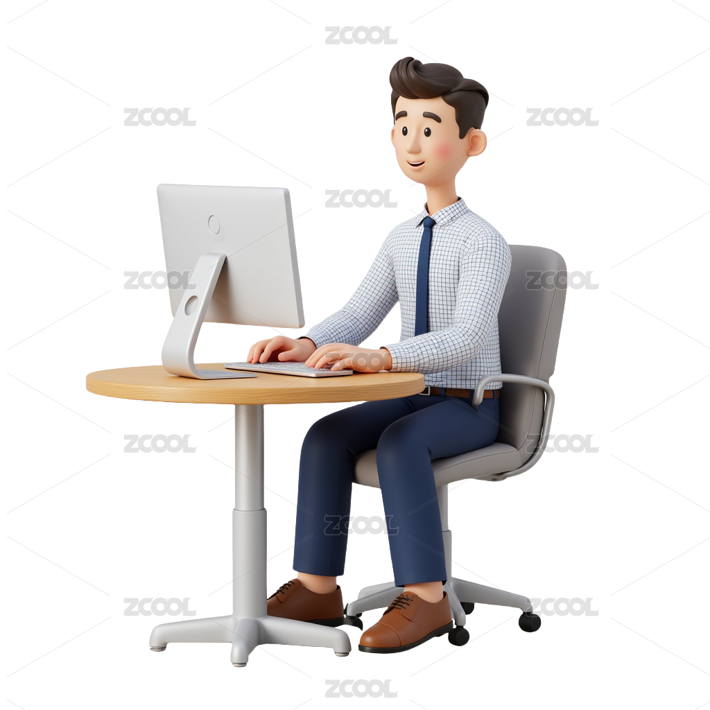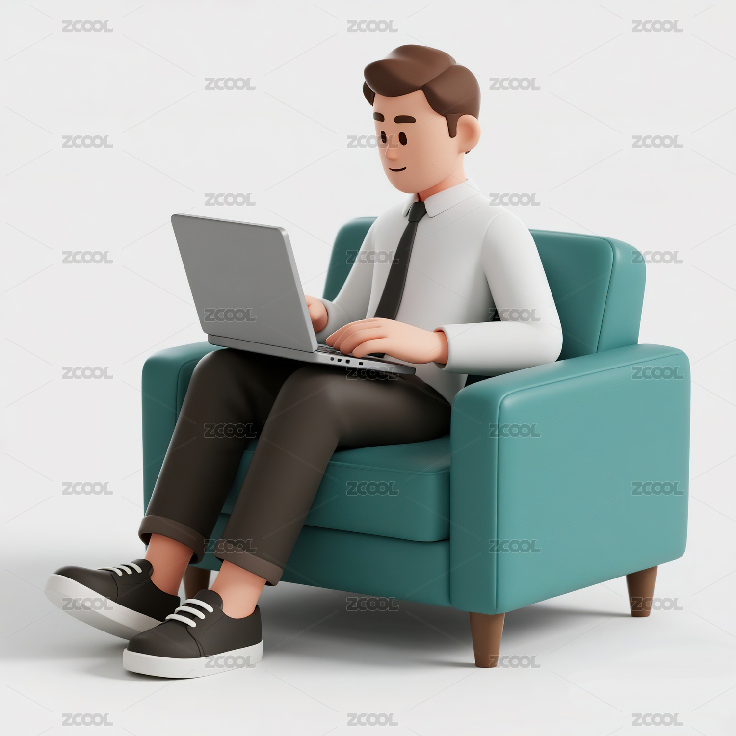 3D职场男士坐在椅子上使用笔记本电脑工作