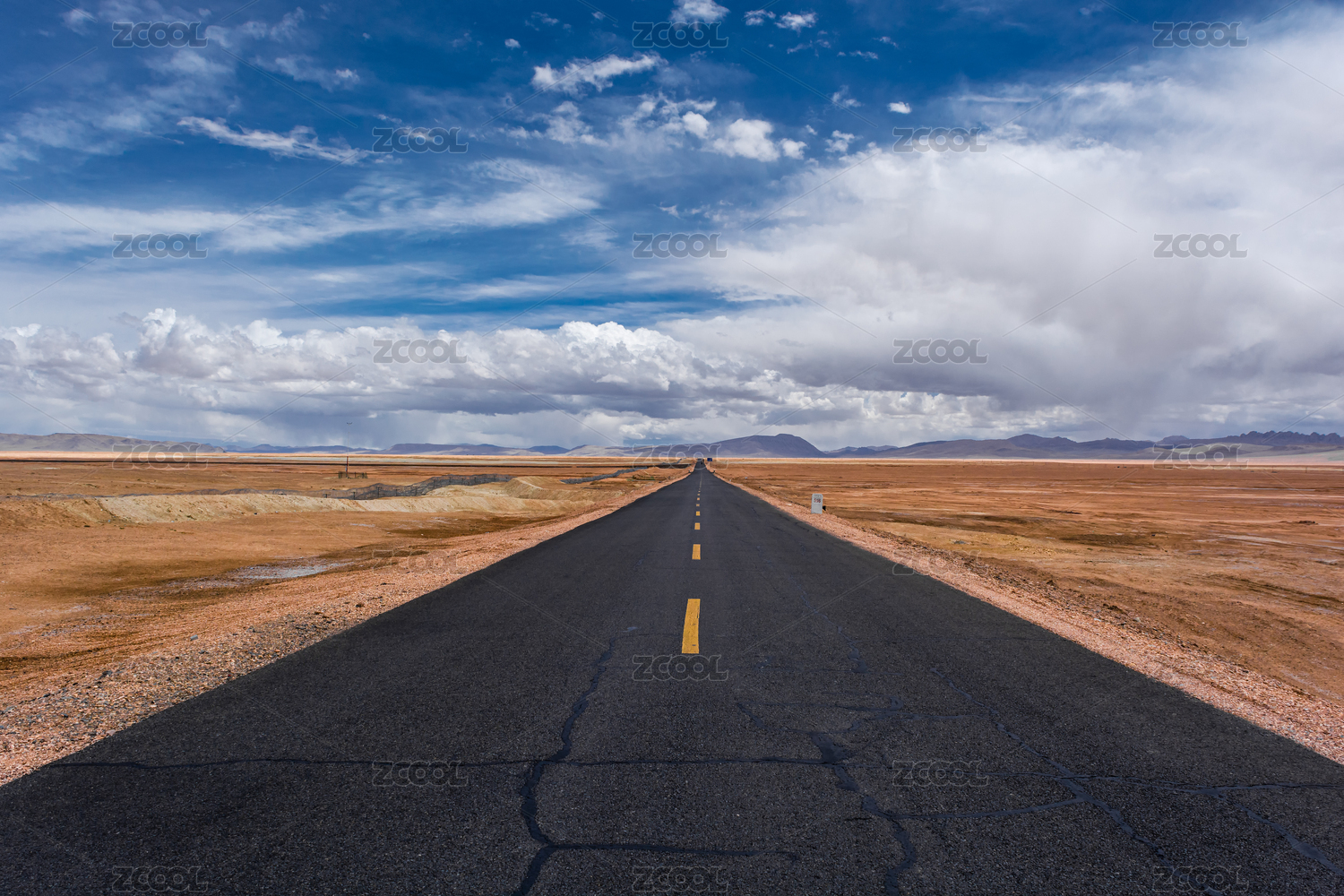蓝天白云下中国G219新藏公路和戈壁荒漠
