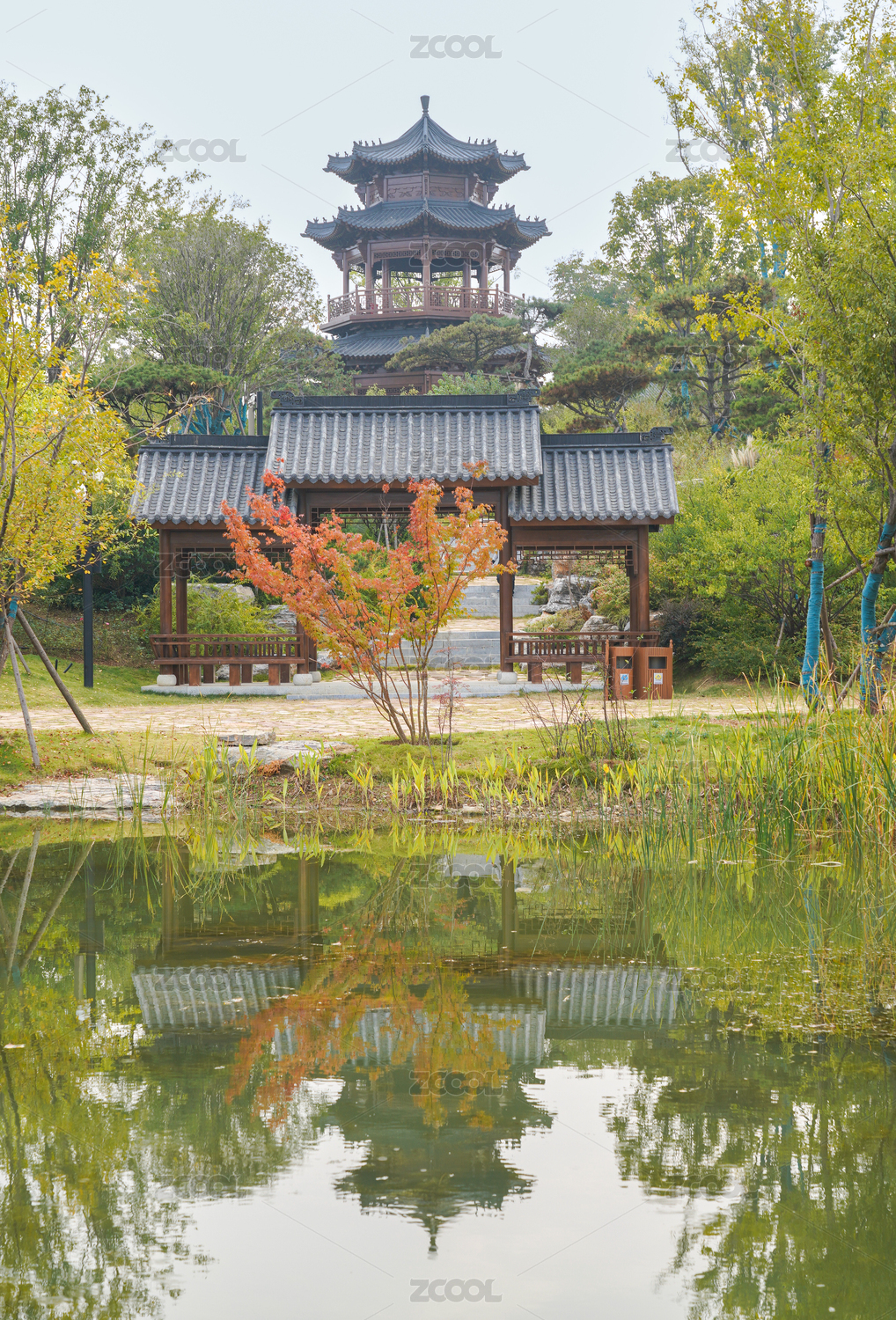 河南南阳卧龙岗文化园景区飞龙潭石亭桥秋色