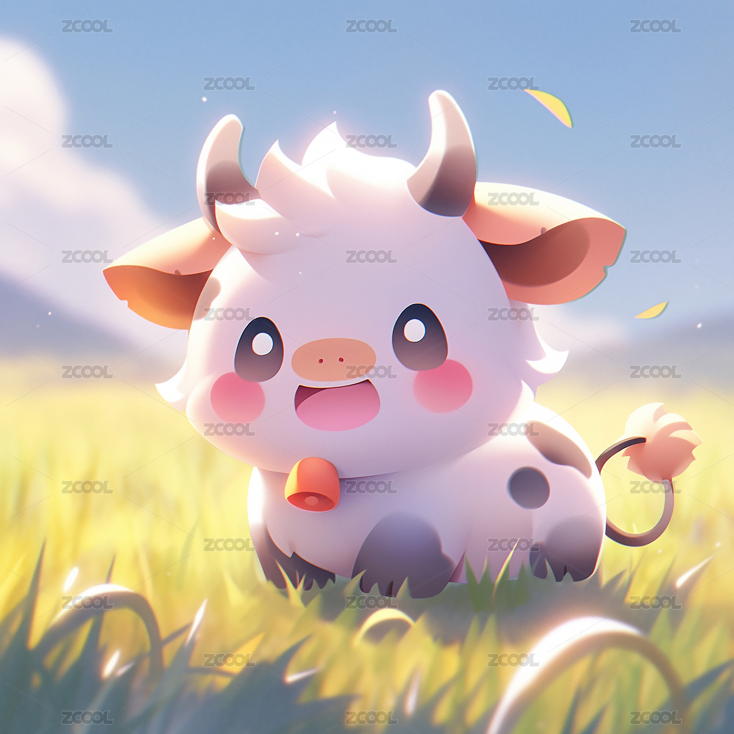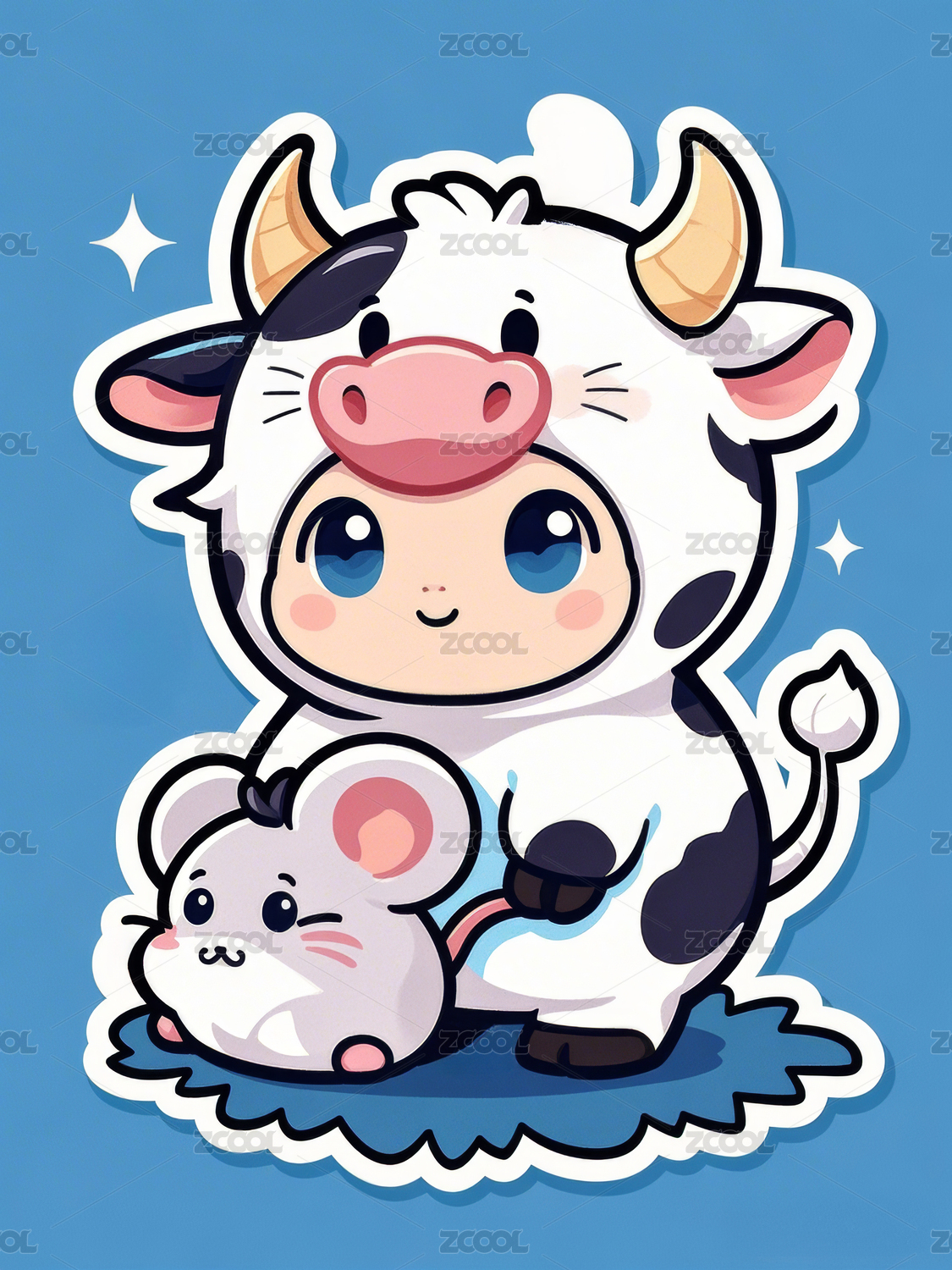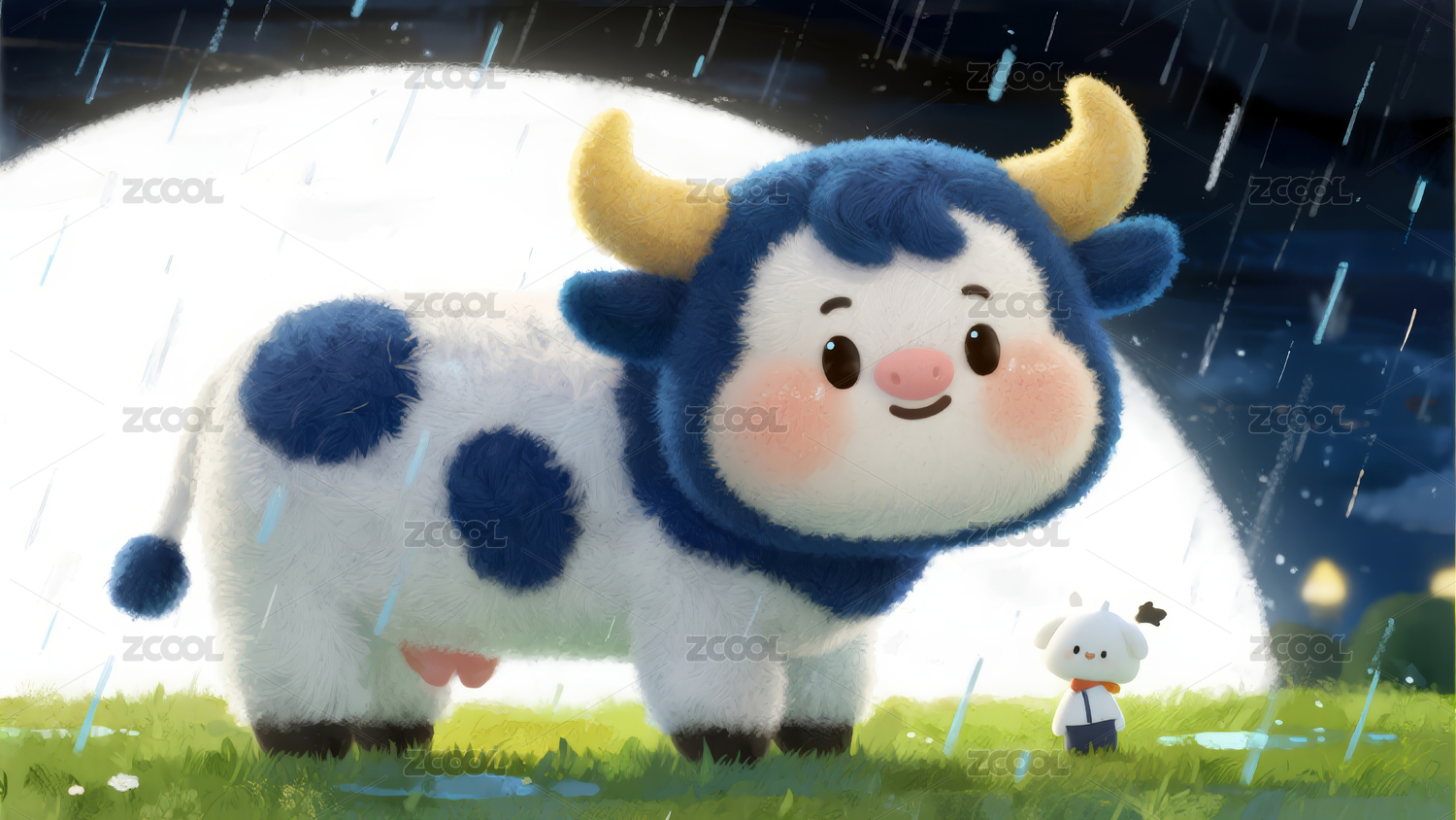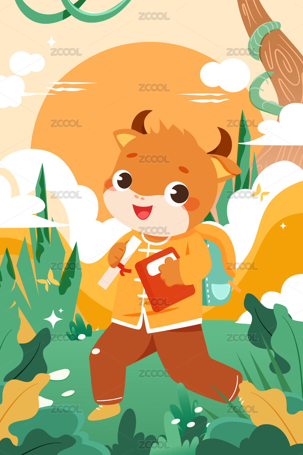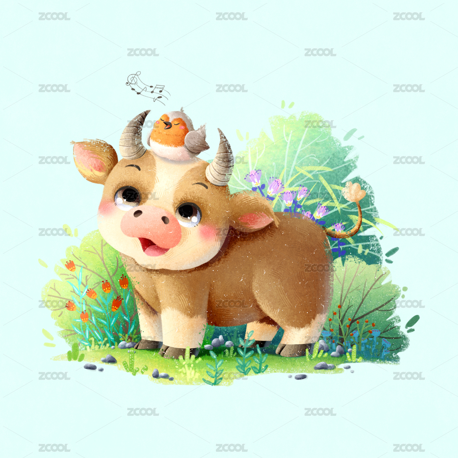 十二生肖之牛牛与小肥啾可爱小场景插画