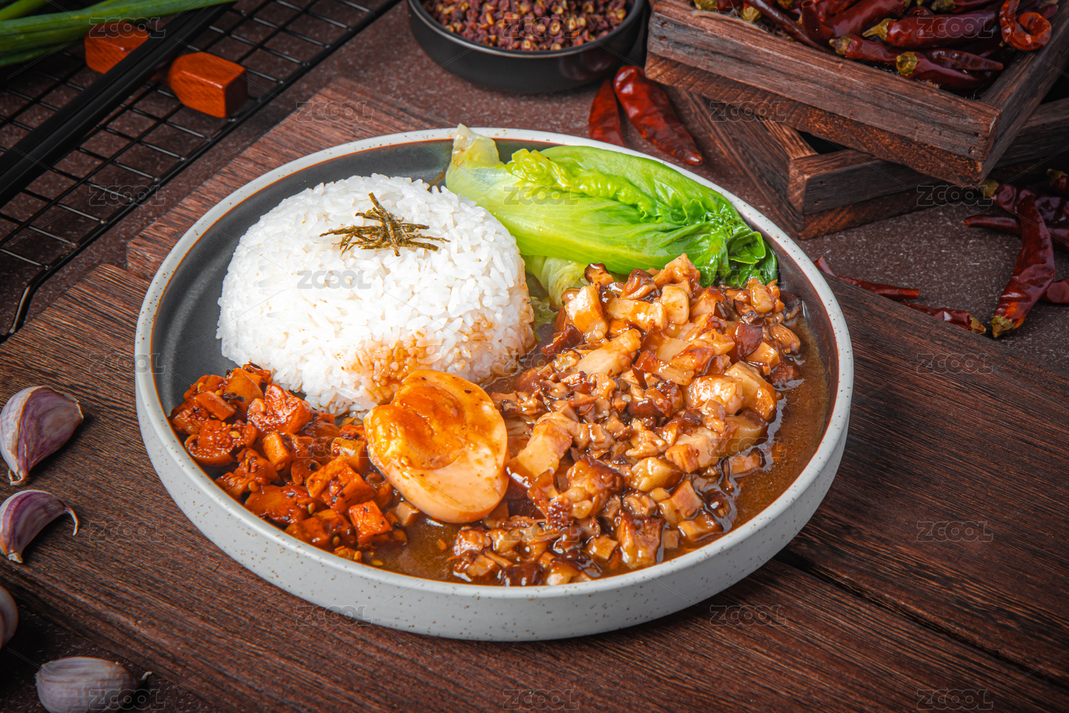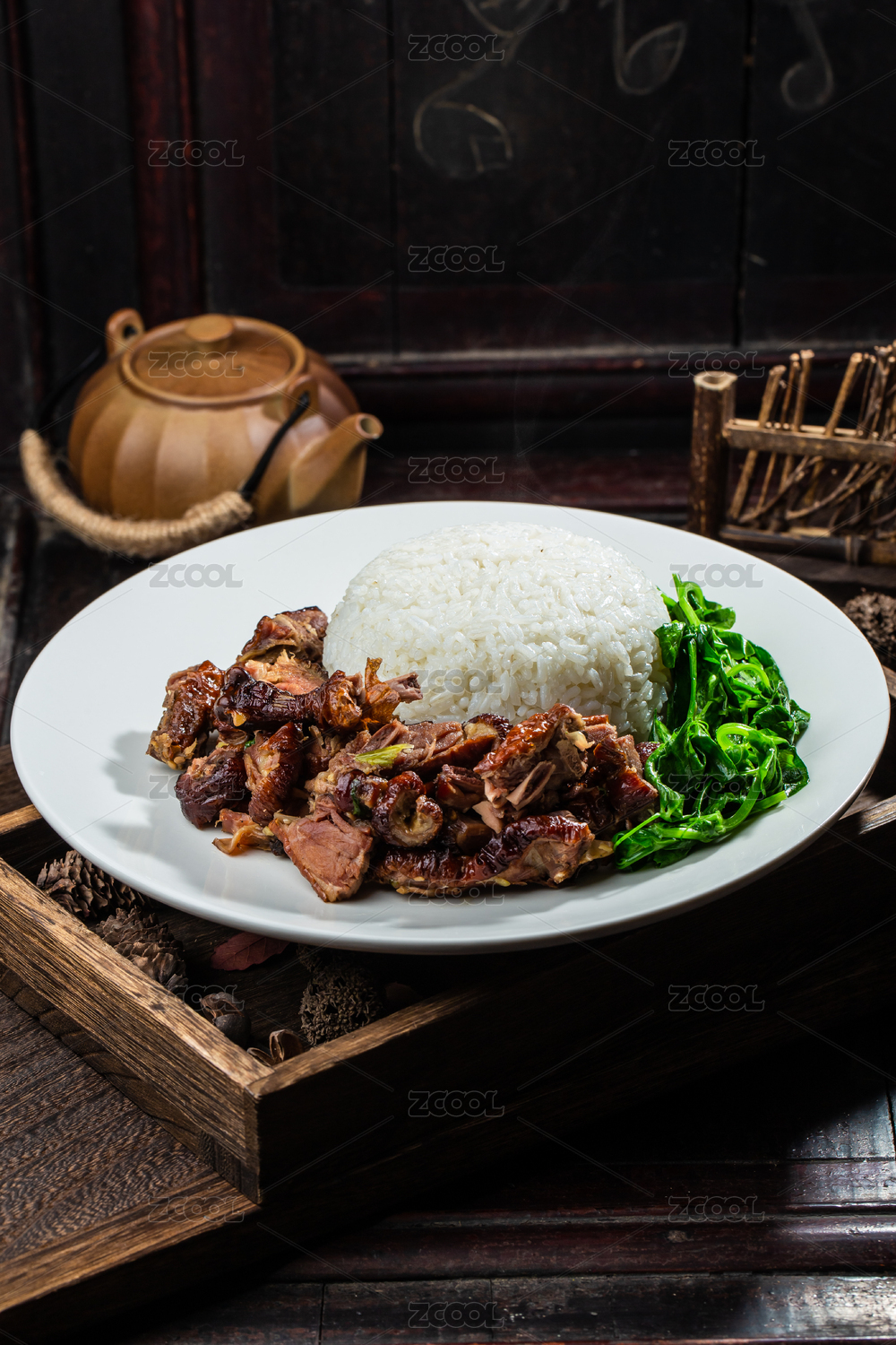 木桌上木盒里手柄沙锅里的豆豉炒肉沙锅饭
