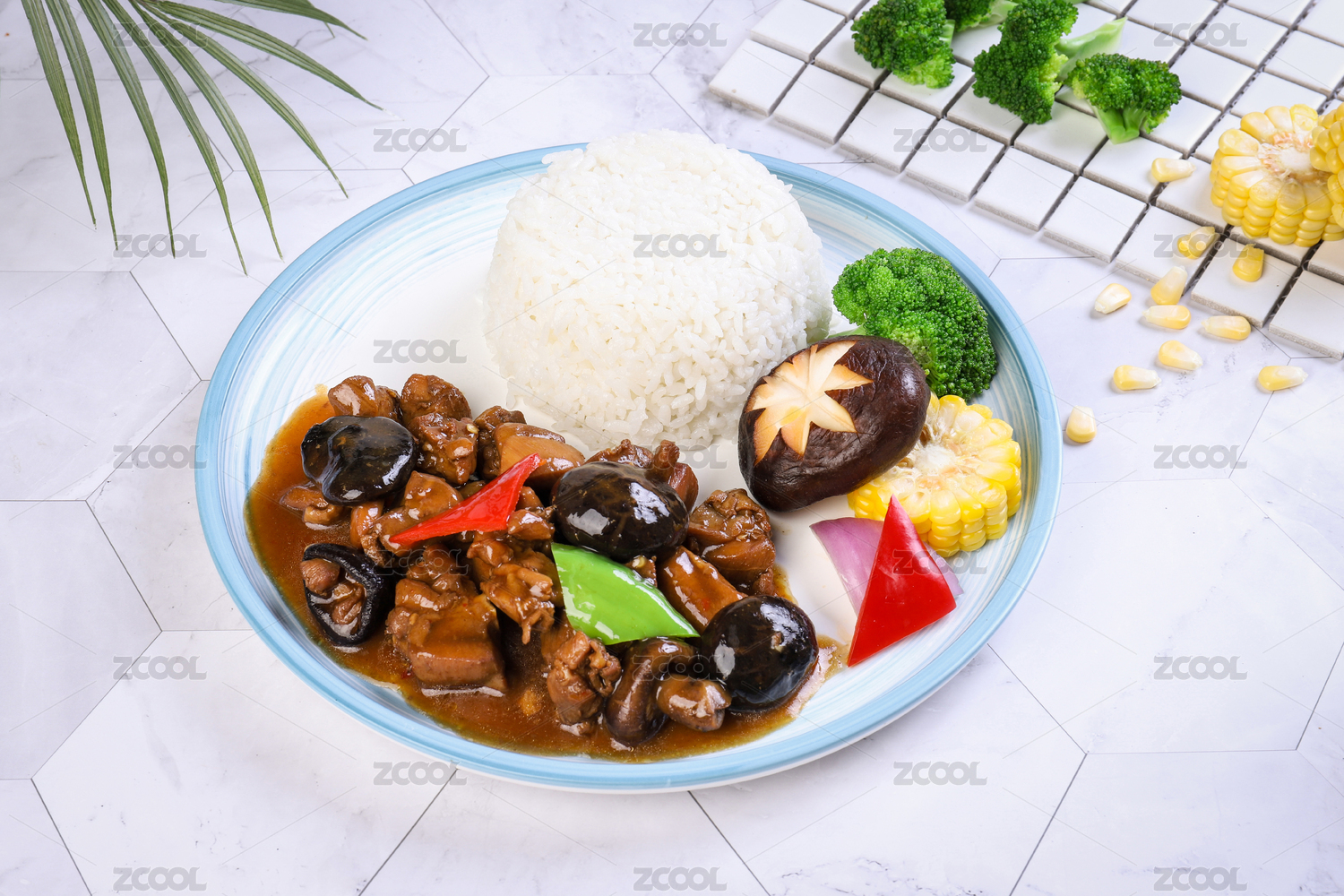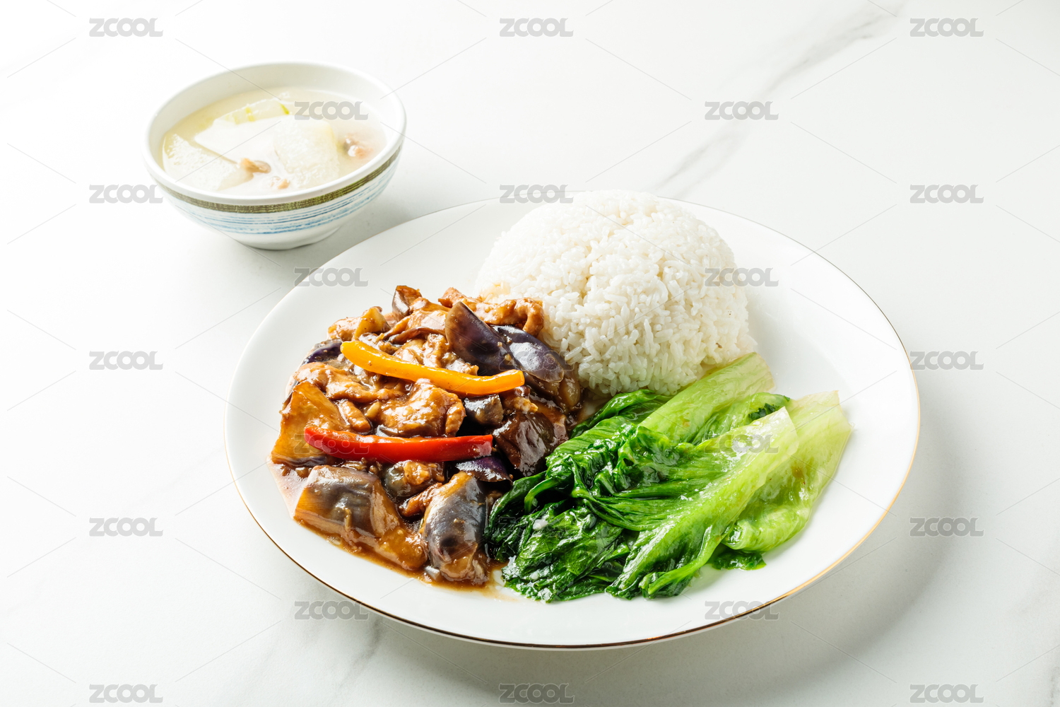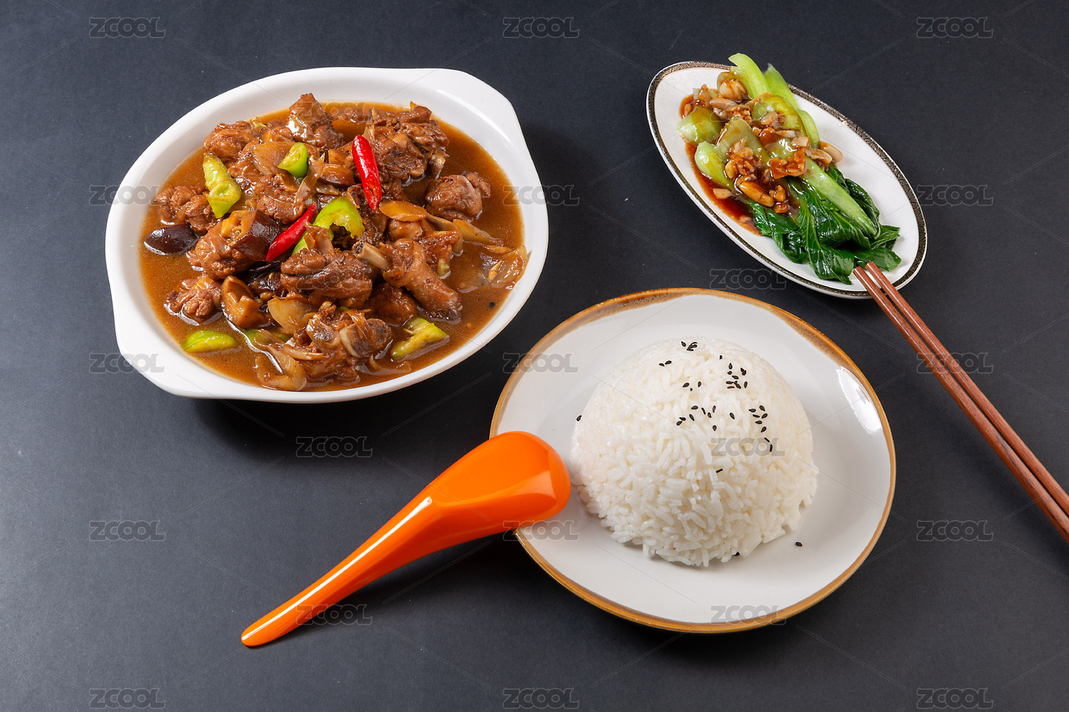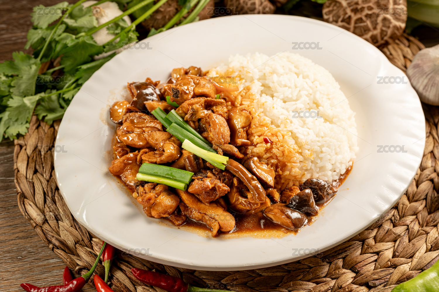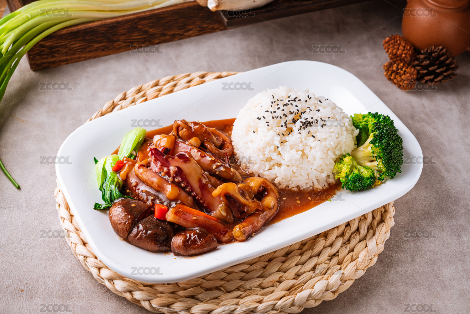 中餐美食一盘美味的辣炒鱿鱼和米饭