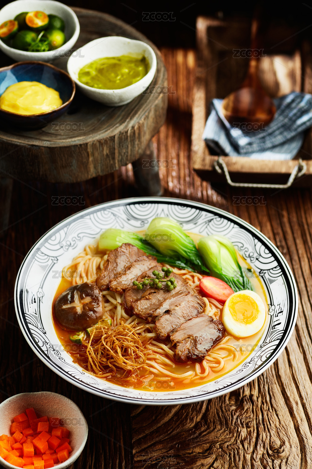 木桌上一碗香辣的红汤牛肉面的竖构图