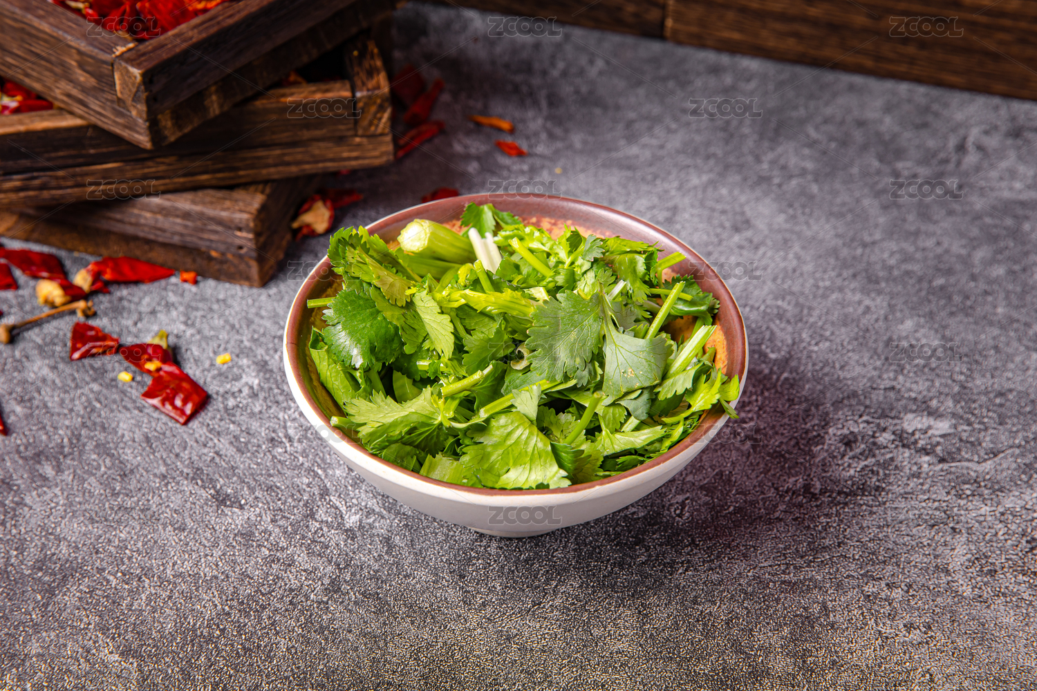 木板背景上一盘新鲜香菜