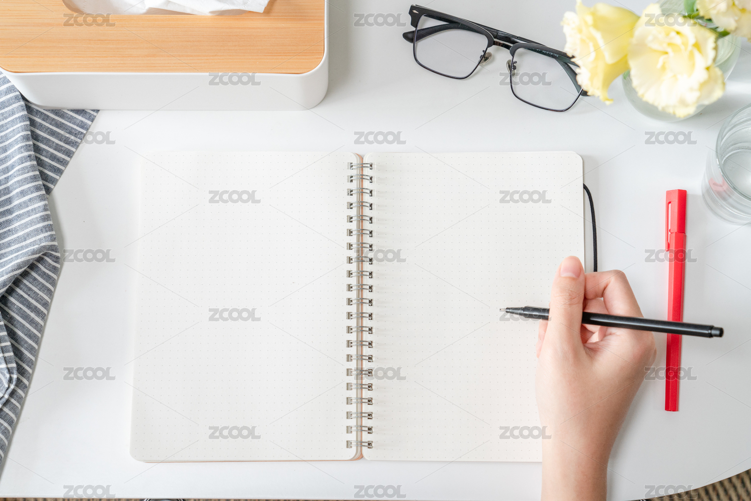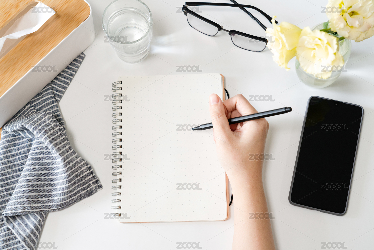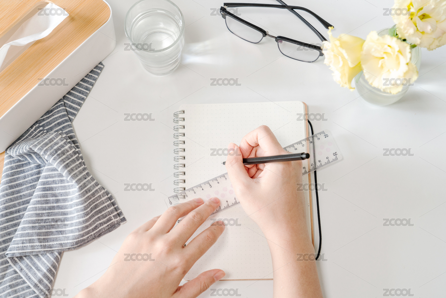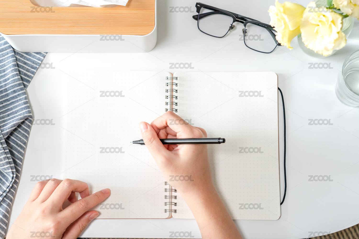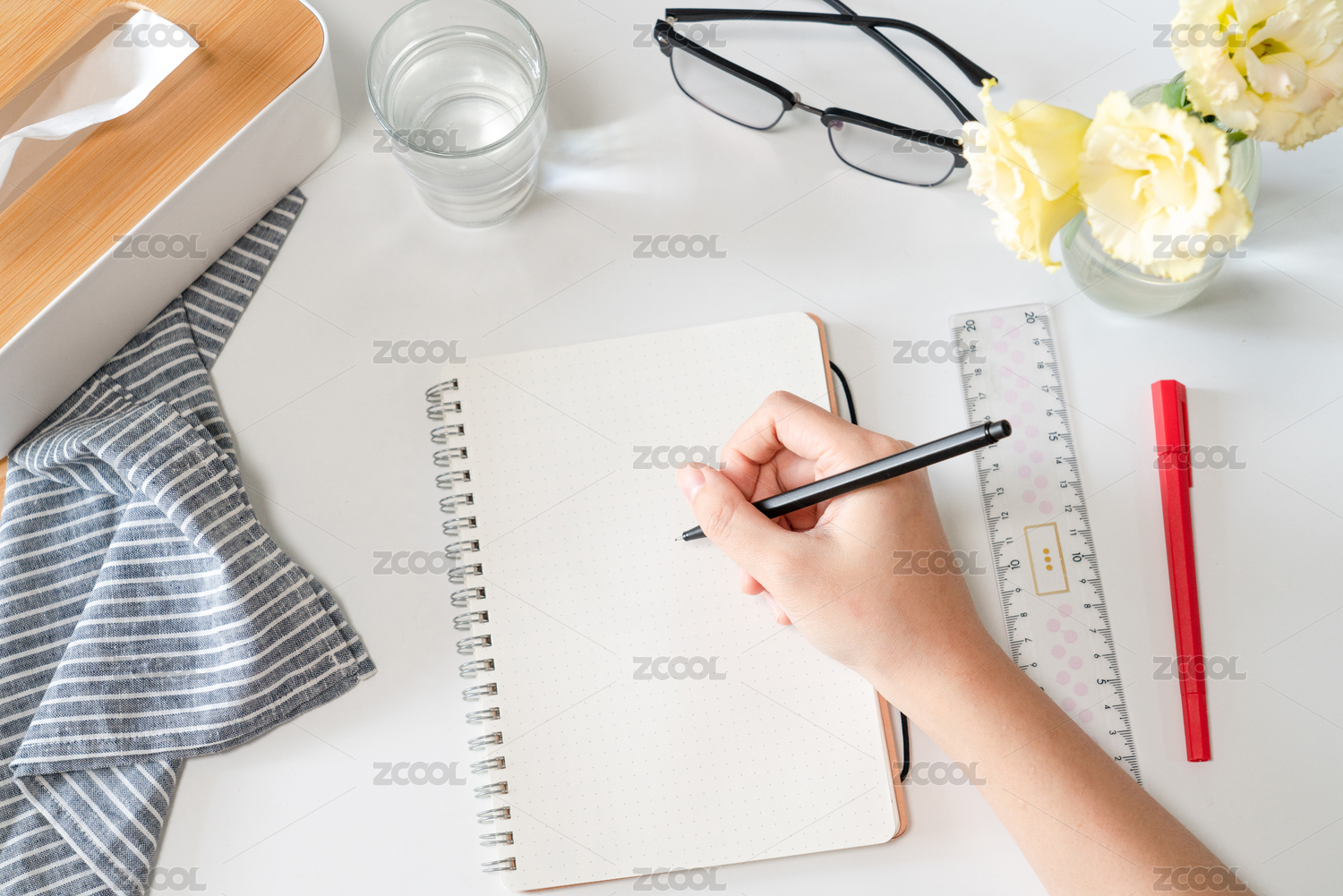 在摆放着眼镜、水杯等物品的桌面上 书写的场景