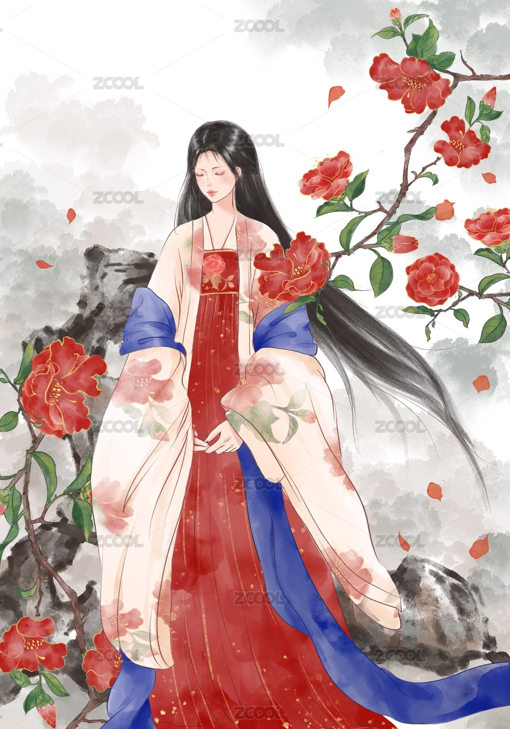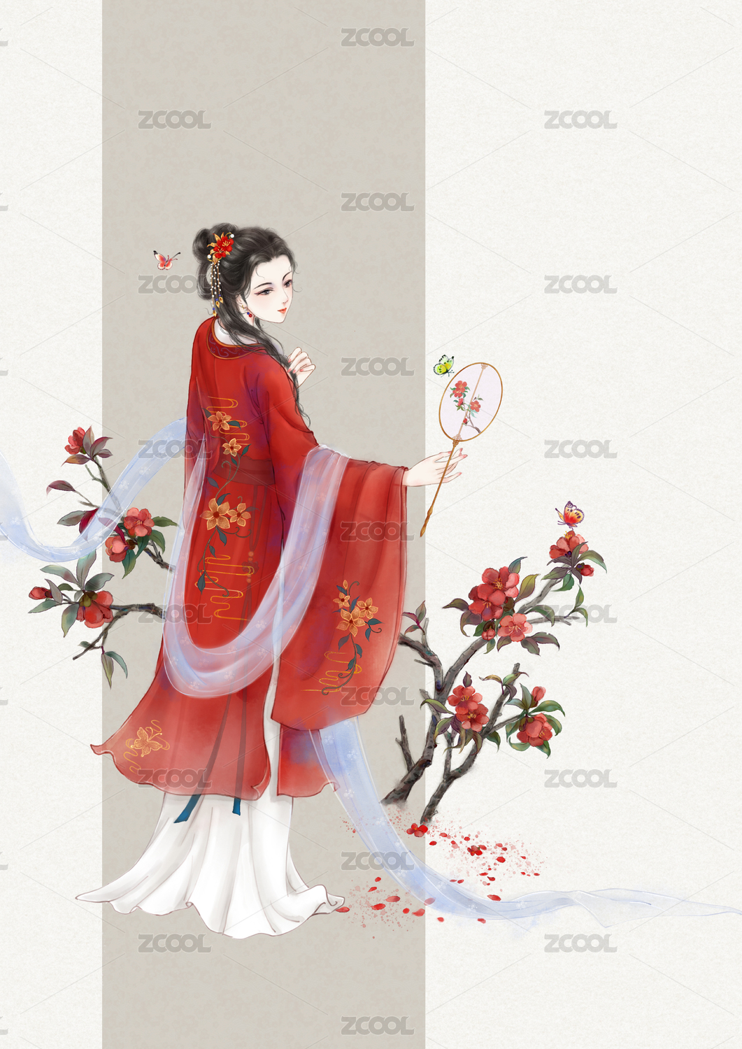 中国风插画灯笼树下一个手拿凤凰花的红衣姑娘