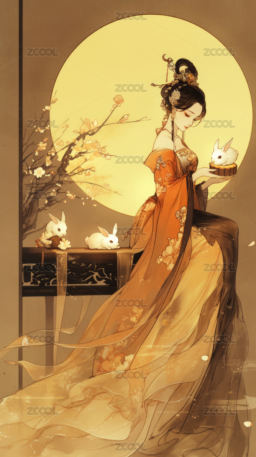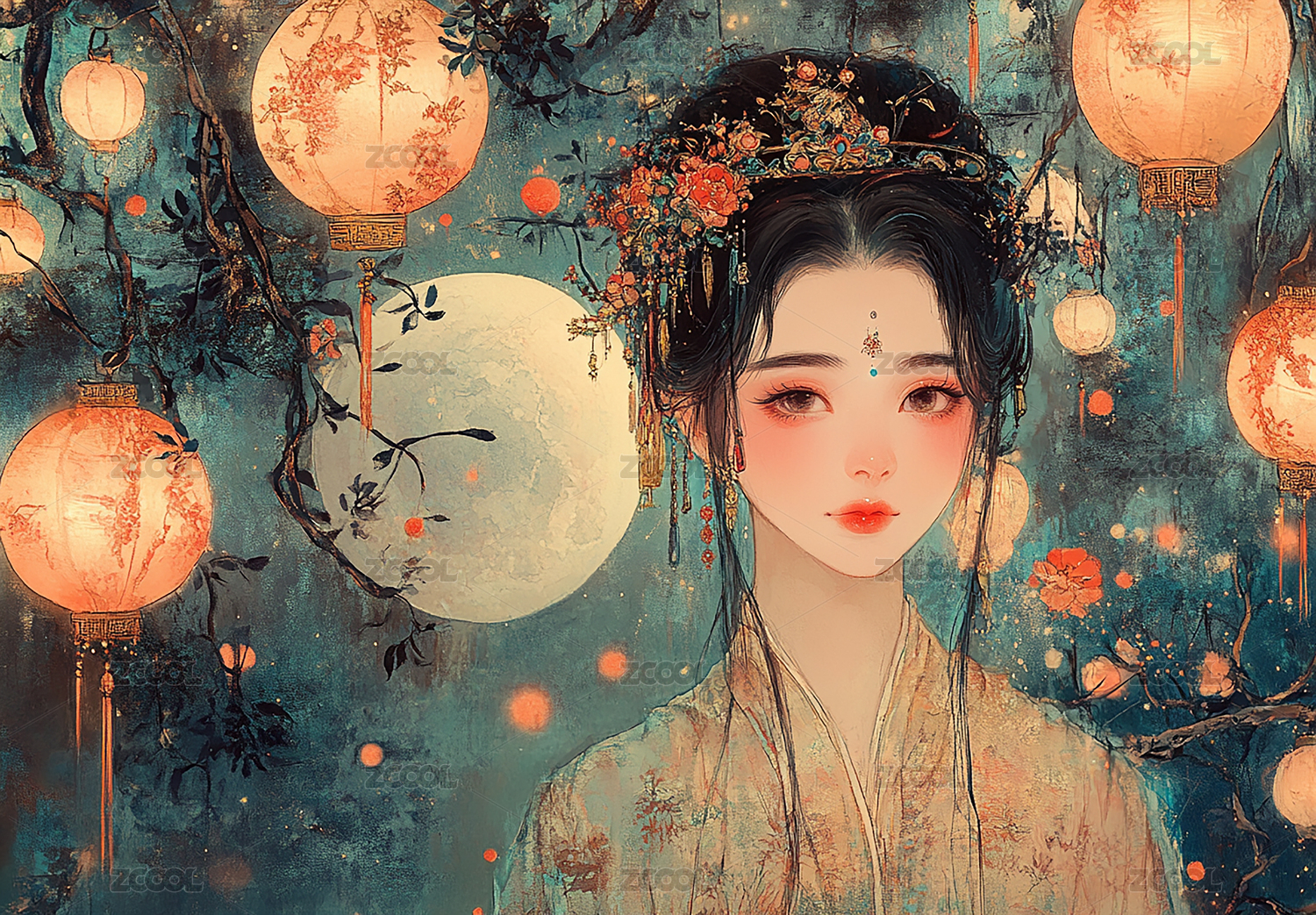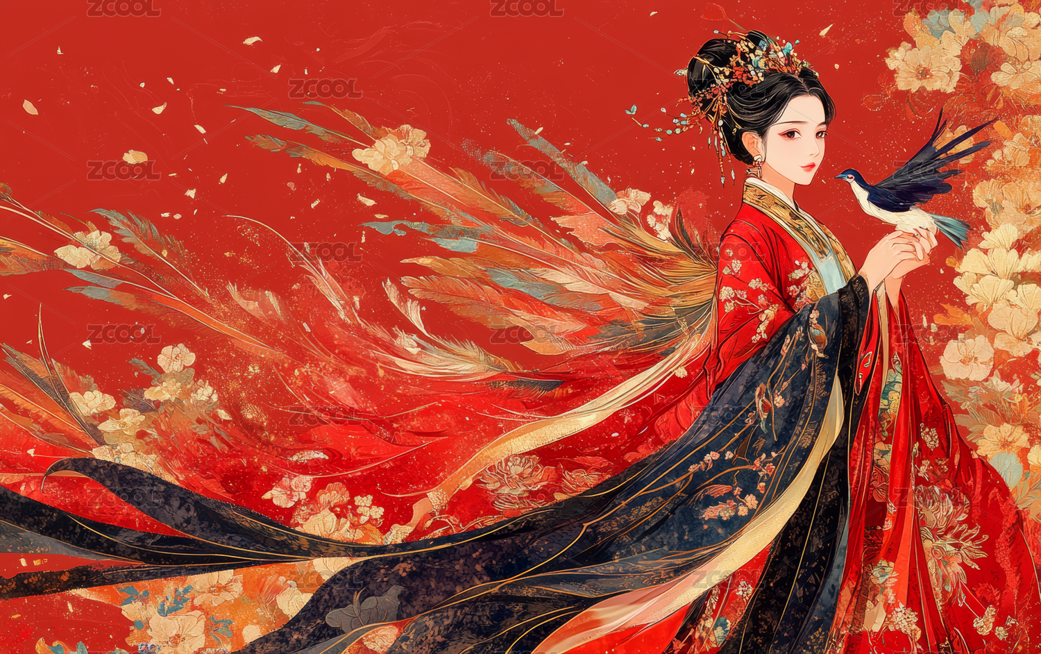 凤凰花,树,灯笼,月亮,星空,汉服,飘带,花,红衣,姑娘