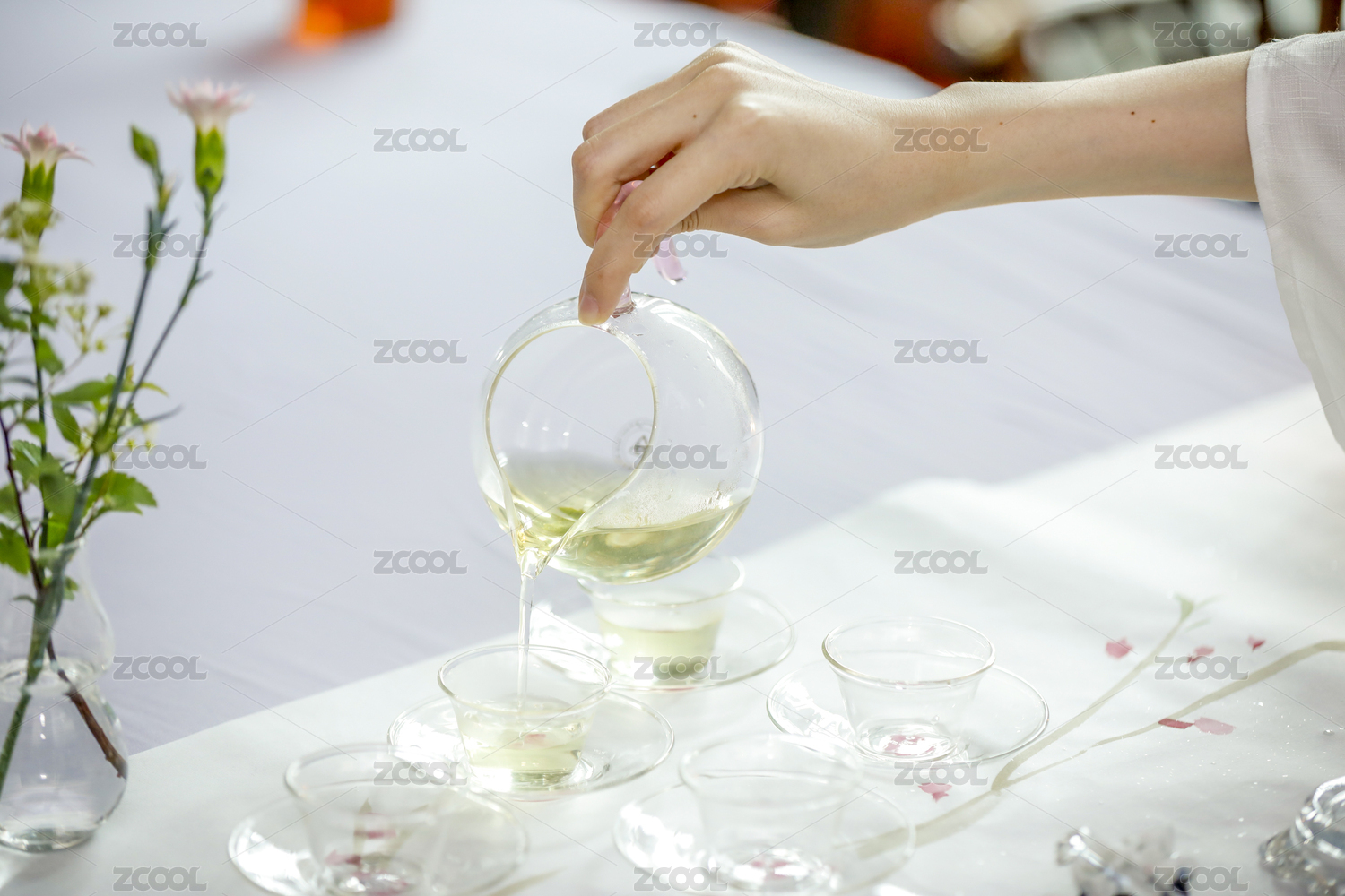 手持仿古玻璃茶壶向玻璃茶杯中倒茶黑色背景