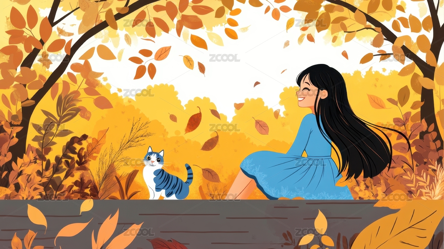 秋天的黄昏女孩带着猫走在落叶的树林中