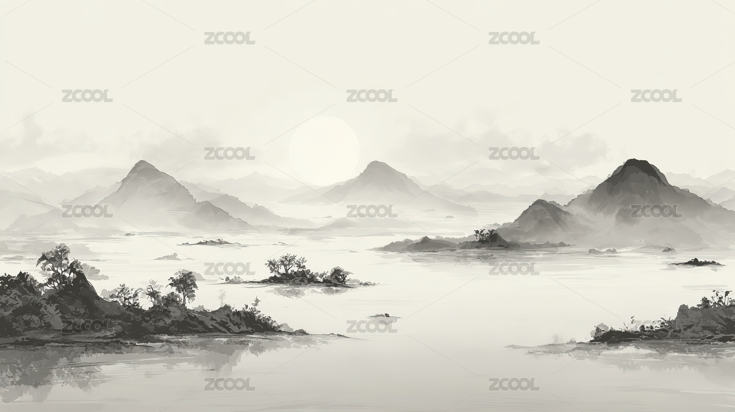 山水画,水墨画,日落,夕阳,红日,山脉,群山,河流,云雾,薄雾