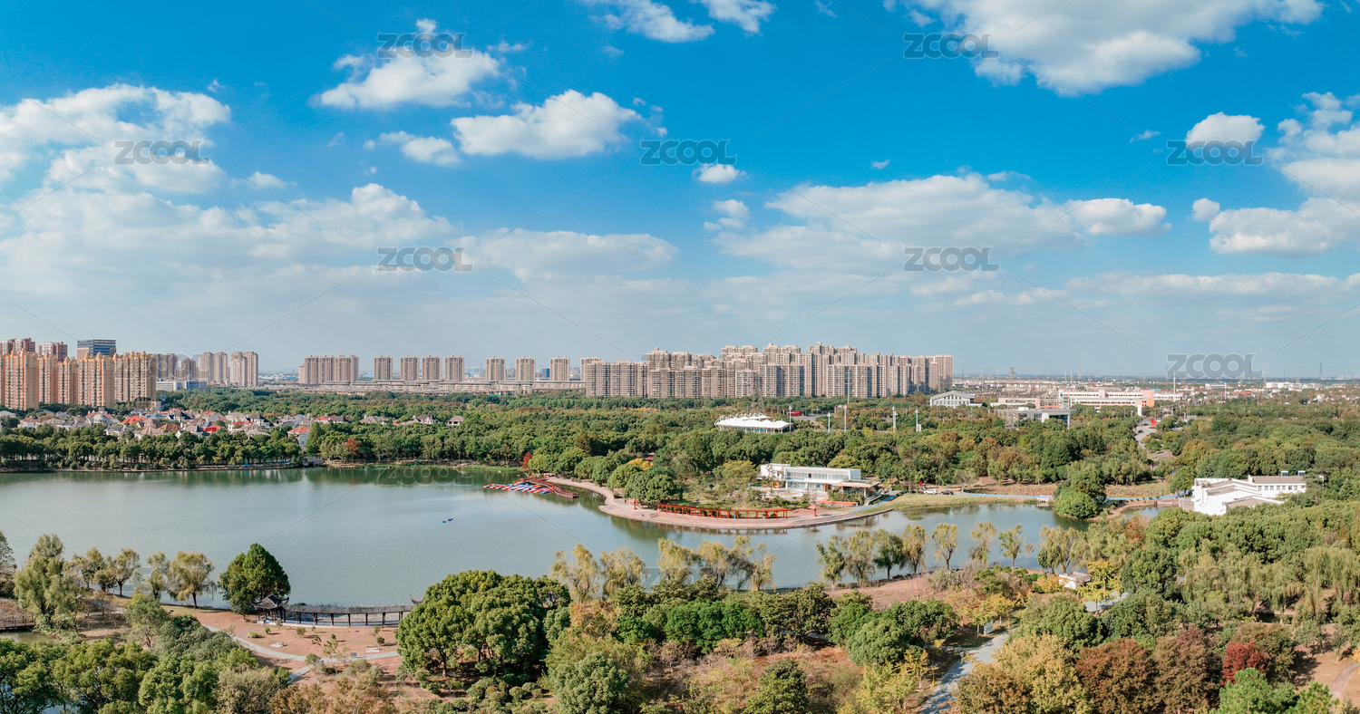 航拍江苏常州钟楼区青枫公园与区政府办公楼