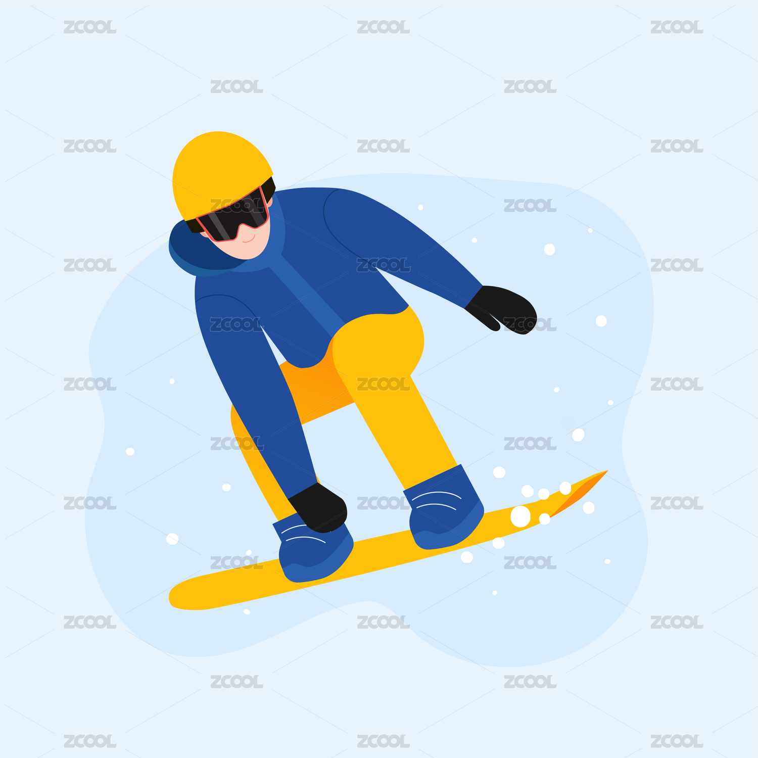 一名男性双板滑雪者 穿着鲜艳的滑雪服在雪地快速滑行 色块风格手绘插画