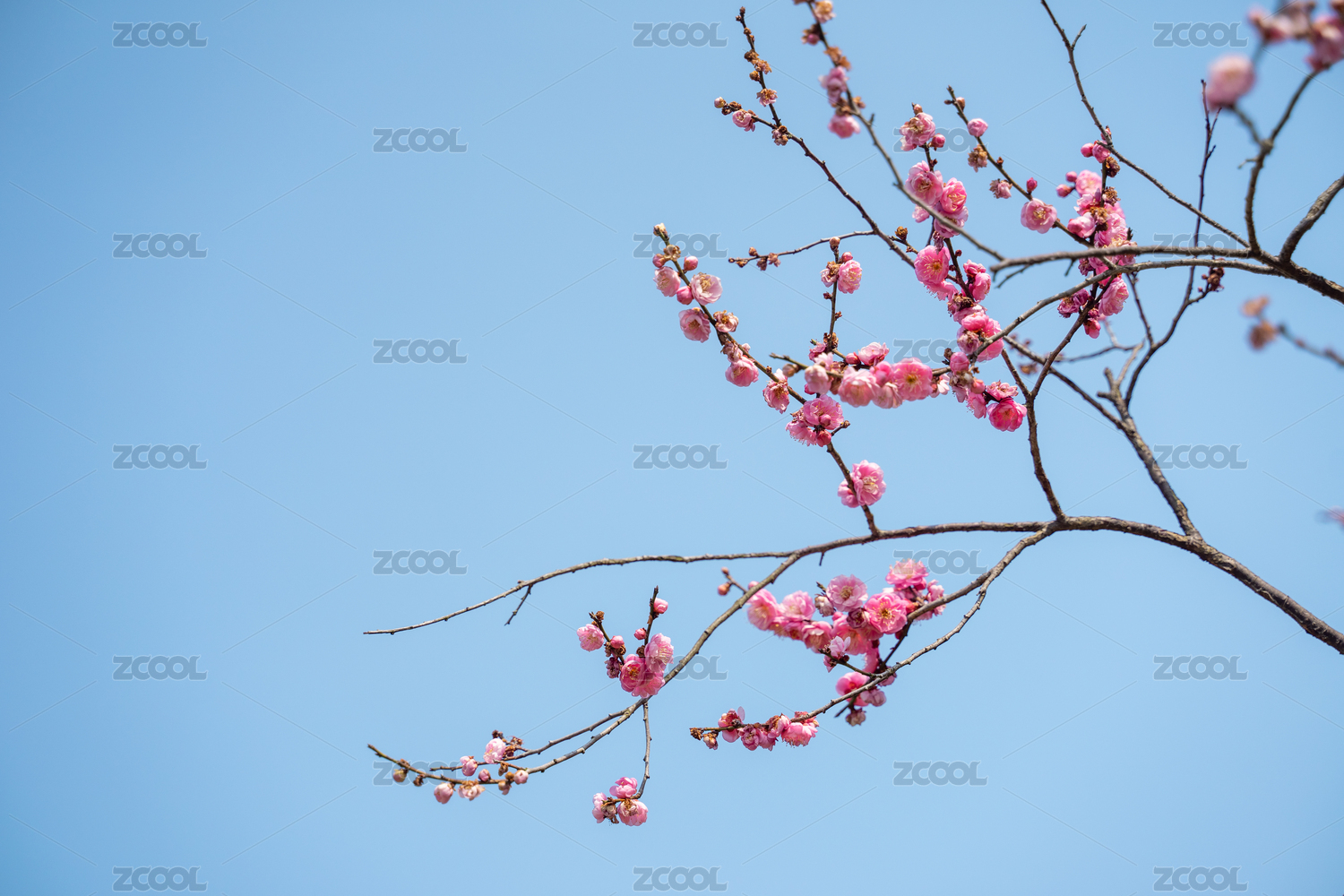 春天仰拍蓝天下盛开的梅花