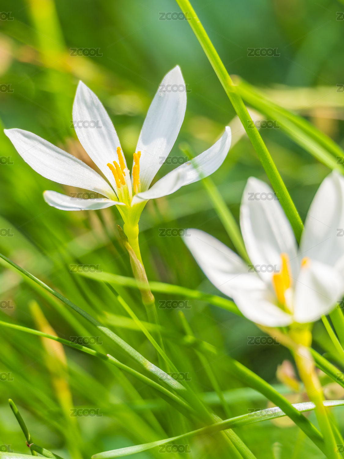 晴朗天气下土地上盛放着白色的葱莲鲜花草药