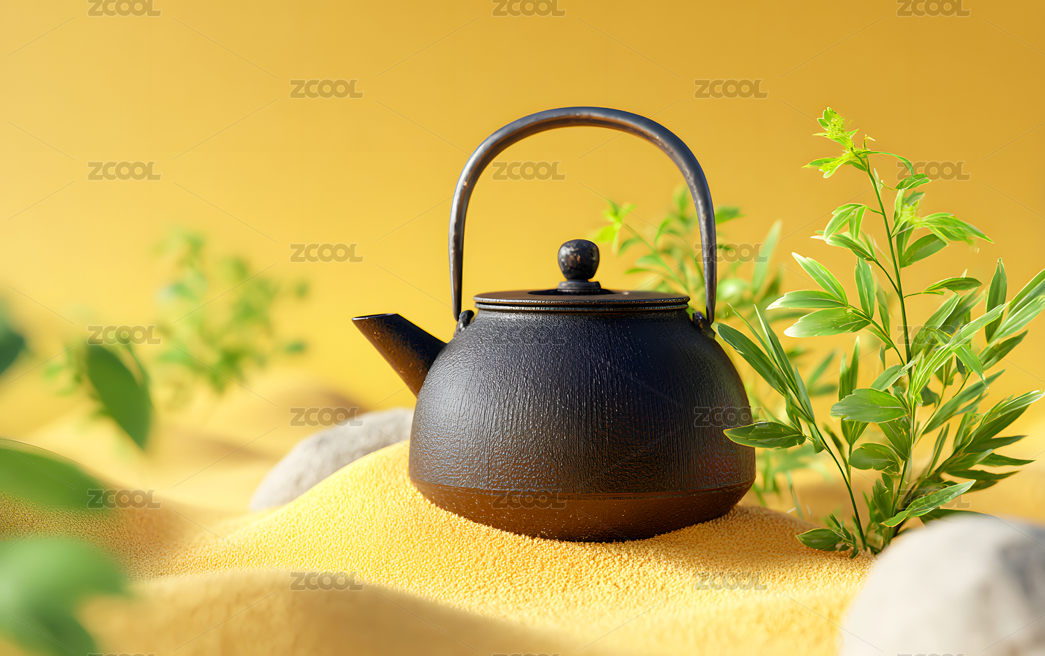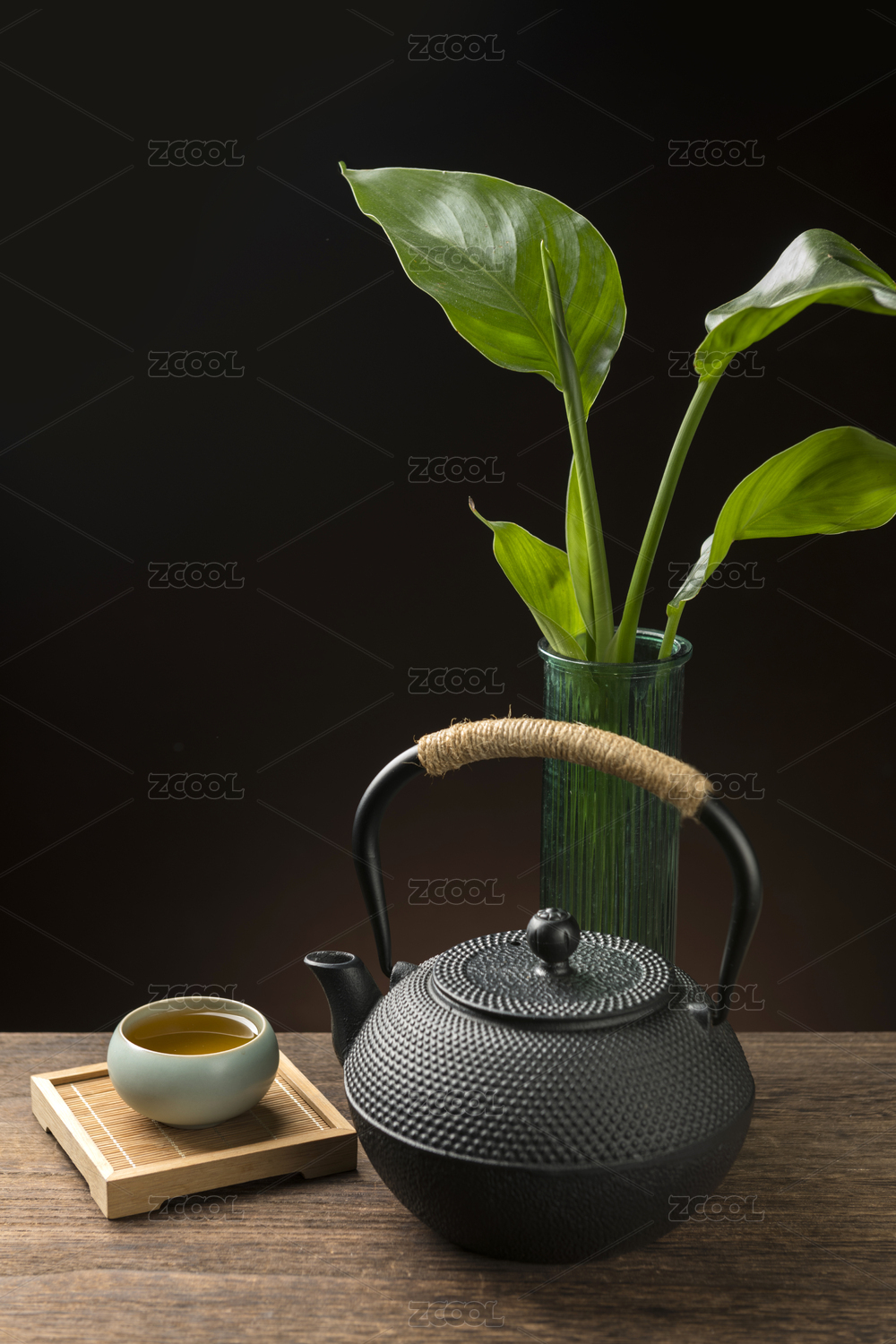 茶壶茶杯绿植摆放在木桌面上特写茶道概念