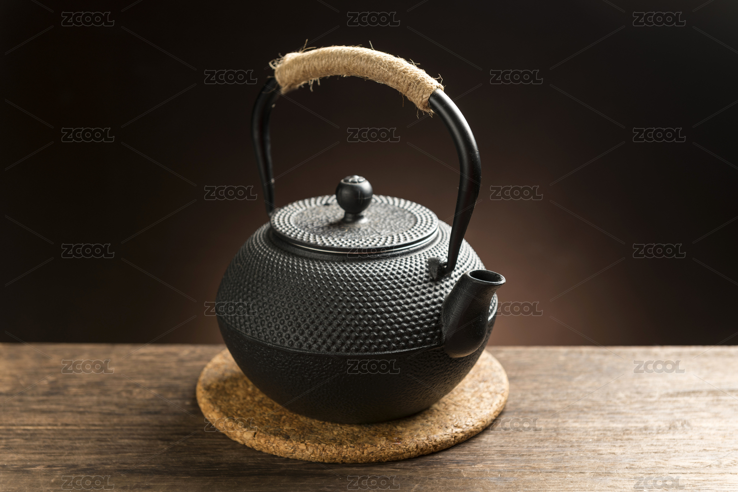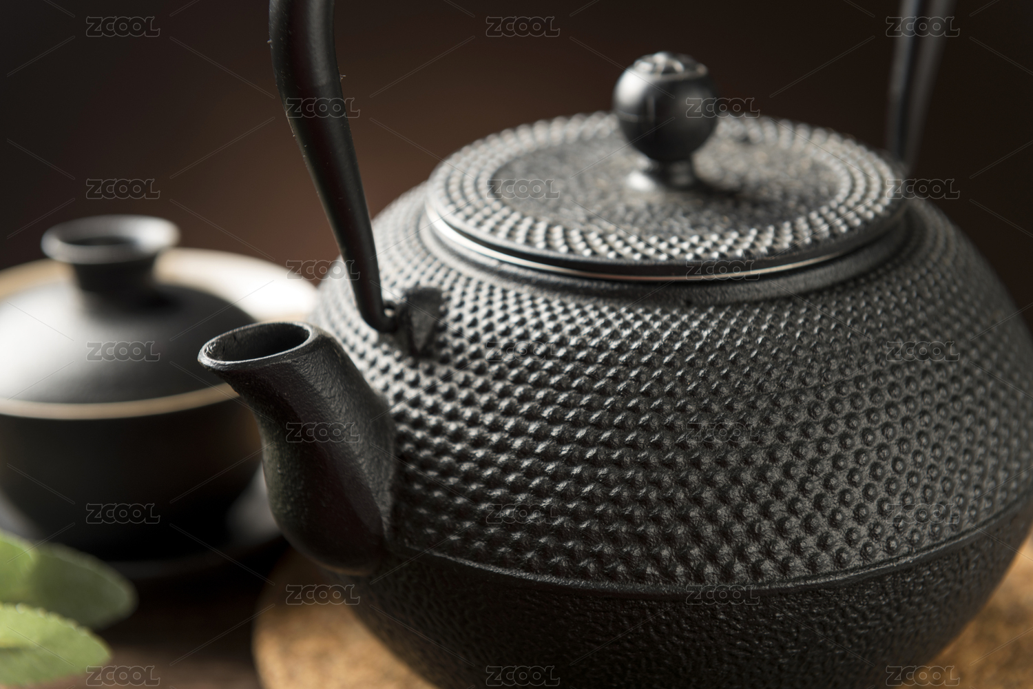 黑陶茶具三才杯盖碗与铁壶摆放在木桌面上
