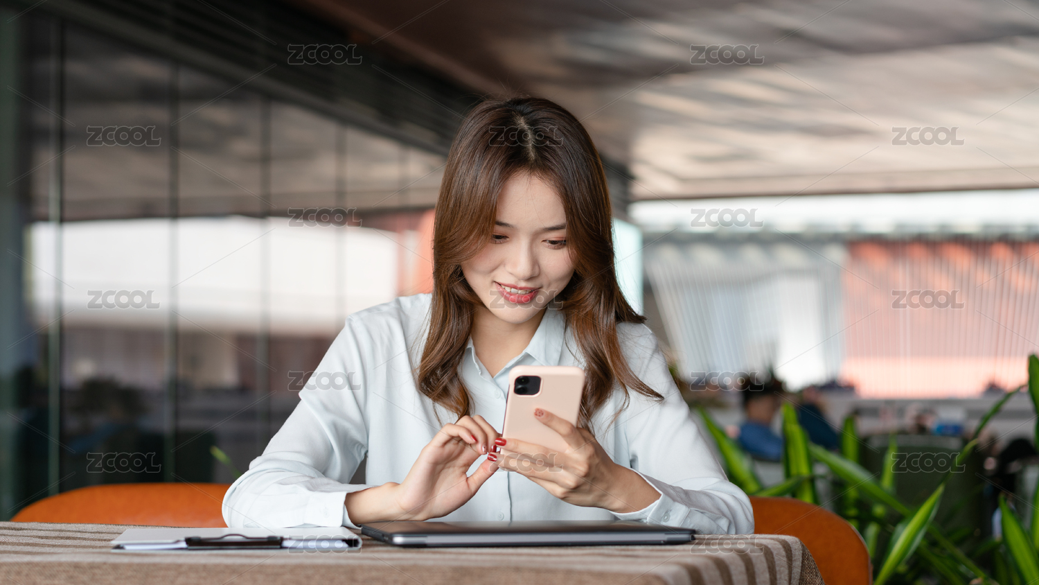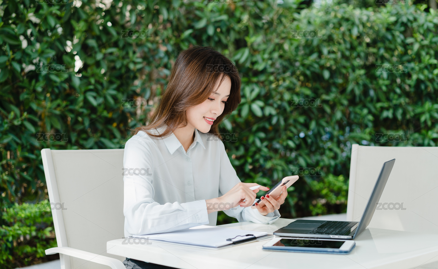 东方职业女性在室外坐在椅子上发信息