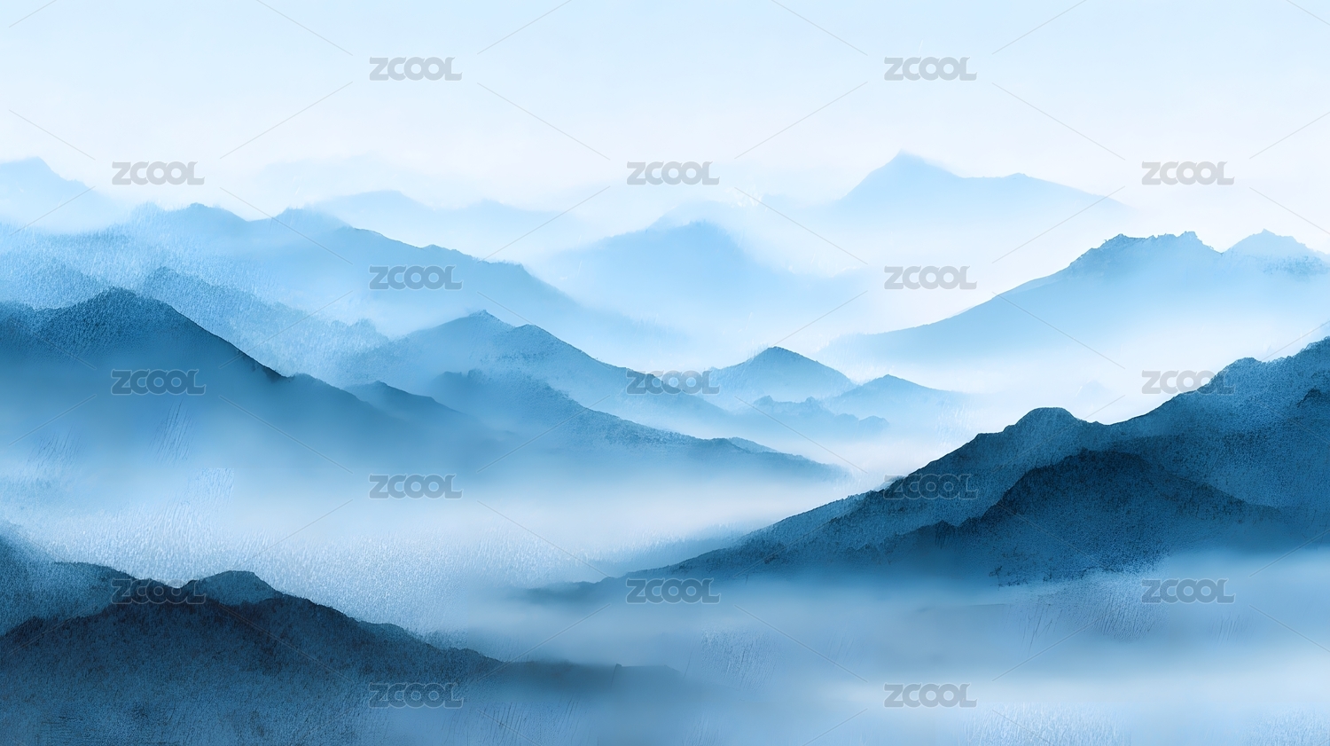 中国水墨画风格的山峰在云雾中若隐若现,展
