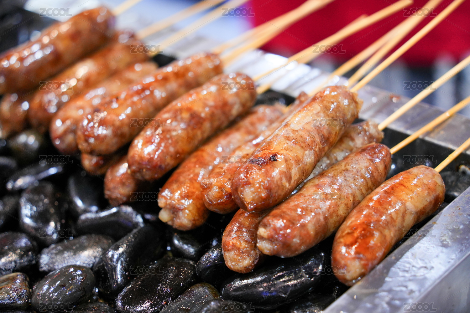 烧烤美食烤串:火腿肠、玉米、烤肉