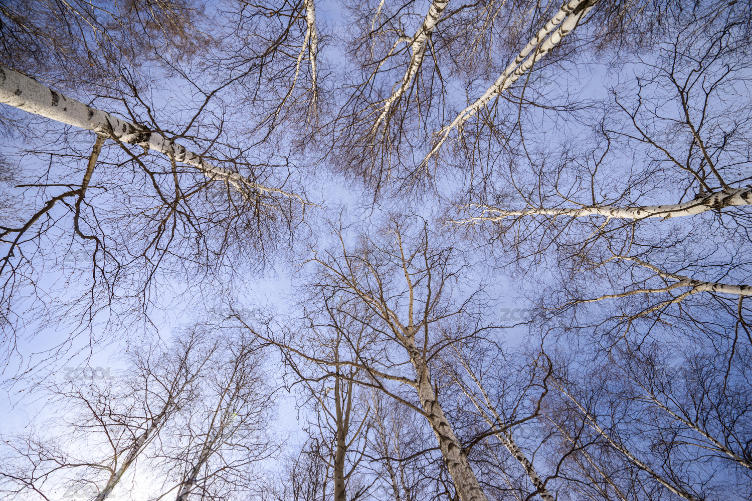 在森林里透过干枯的树枝仰望蓝天