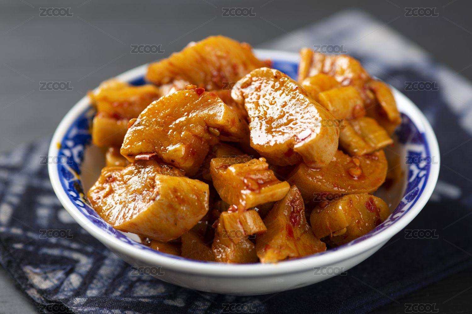 一盘香辣萝卜干摆放在桌面上特写