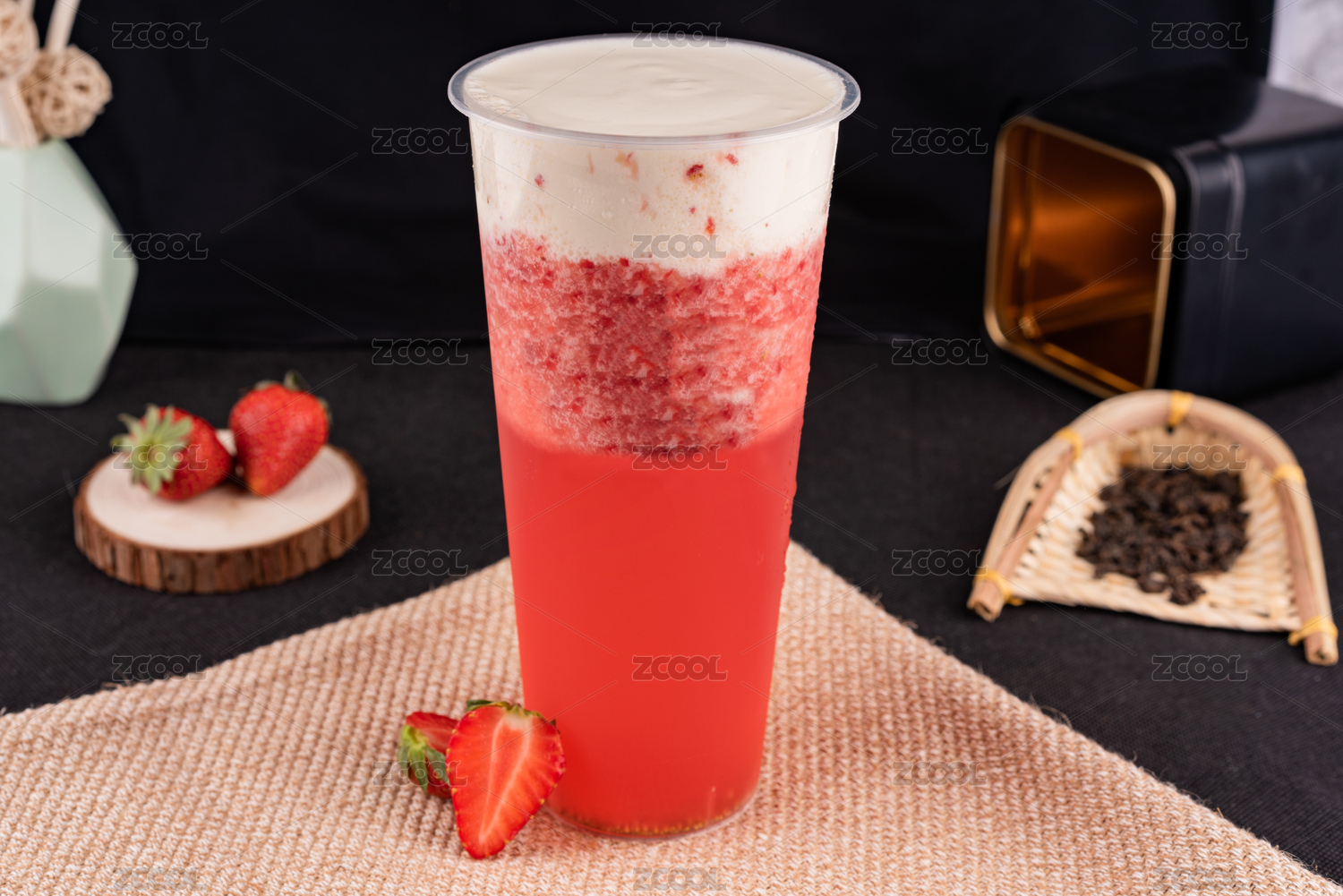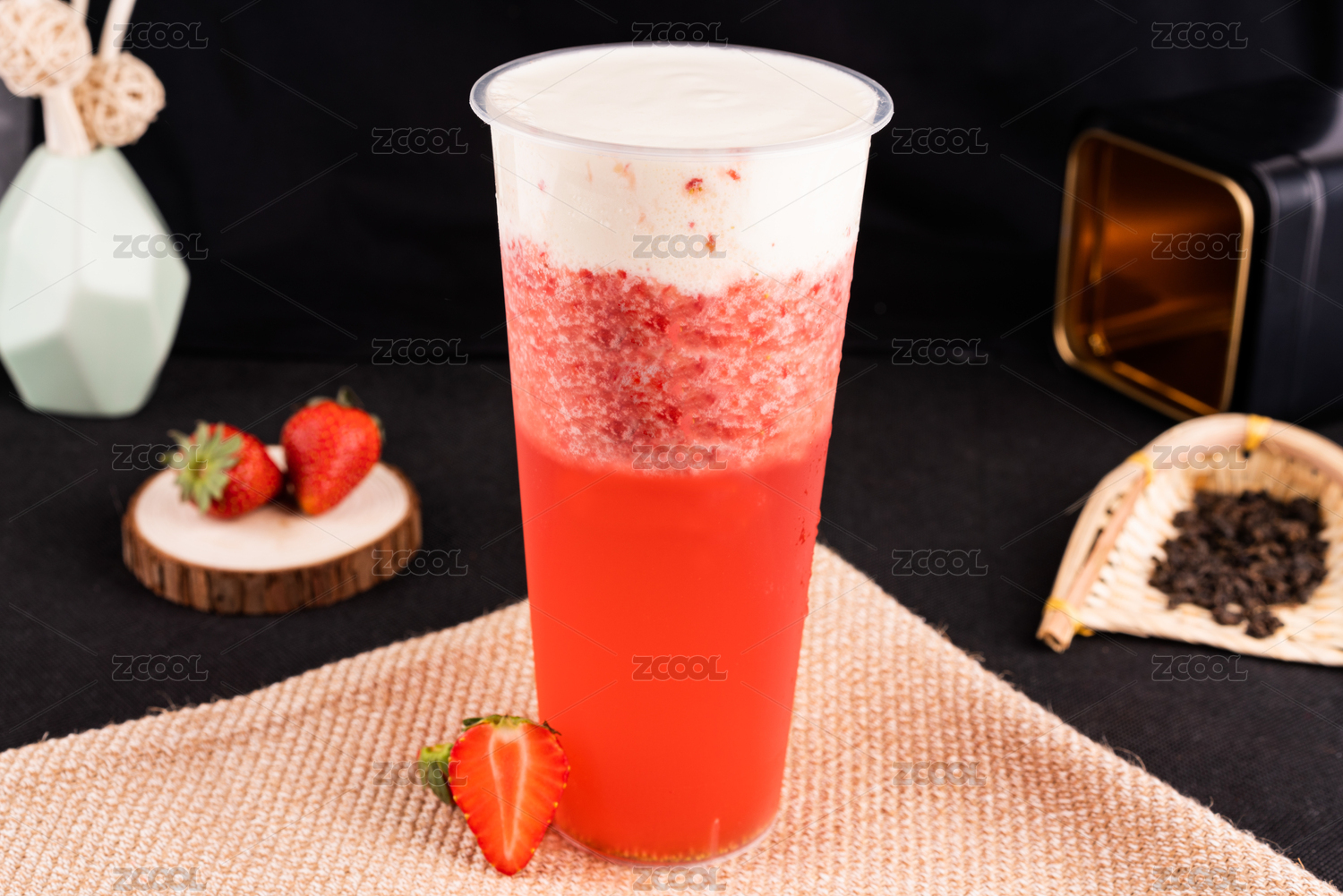 黑色背景下的鲜榨冰冻草莓沙冰奶盖