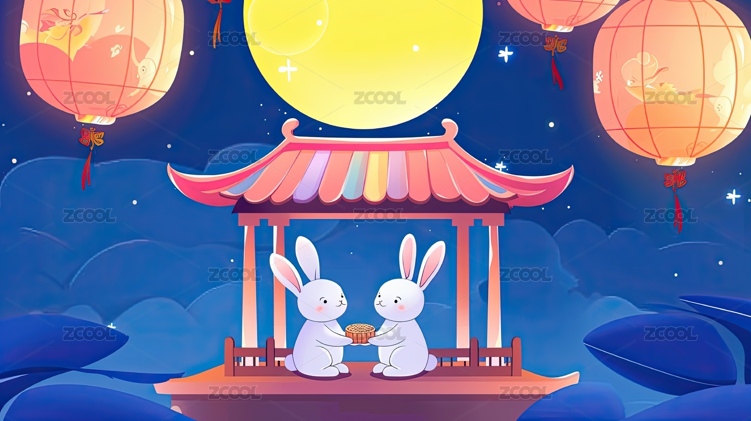 中秋夜景玉兔与月饼
