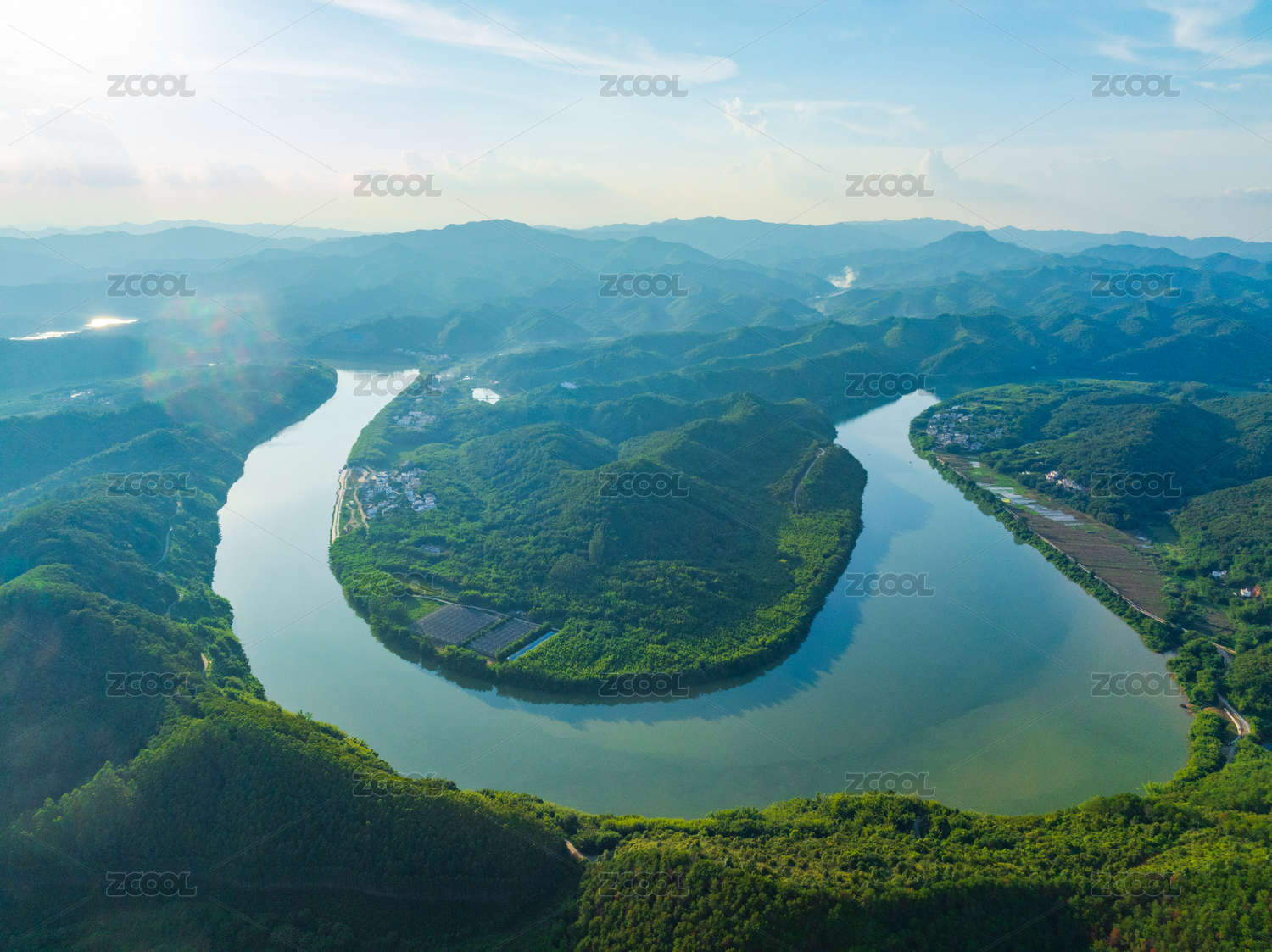 航拍澜沧江自然风光和周围的建筑